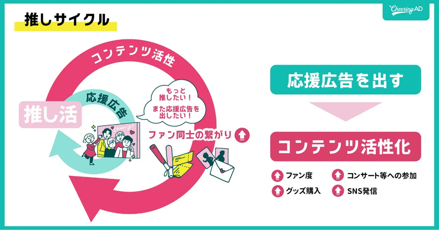 私たちは、このサイクルを「推しサイクル」と名付け、今回のサービス拡充により、日本だけではなく、世界中の推しを愛するファンの皆さまの応援広告サポートサービスを通じて、この「推しサイクル」を促進し、コンテンツの活性化に貢献してまいります。