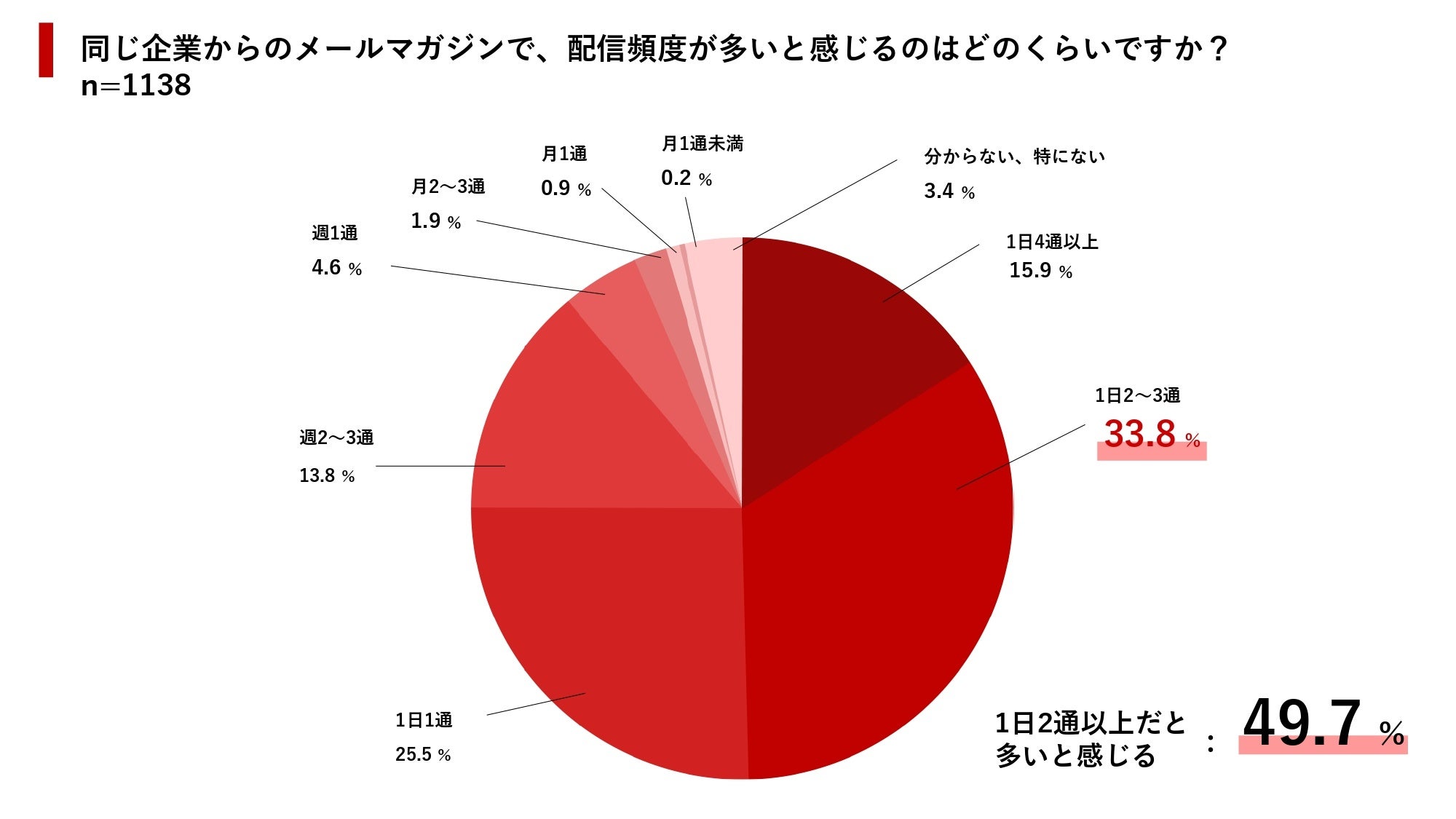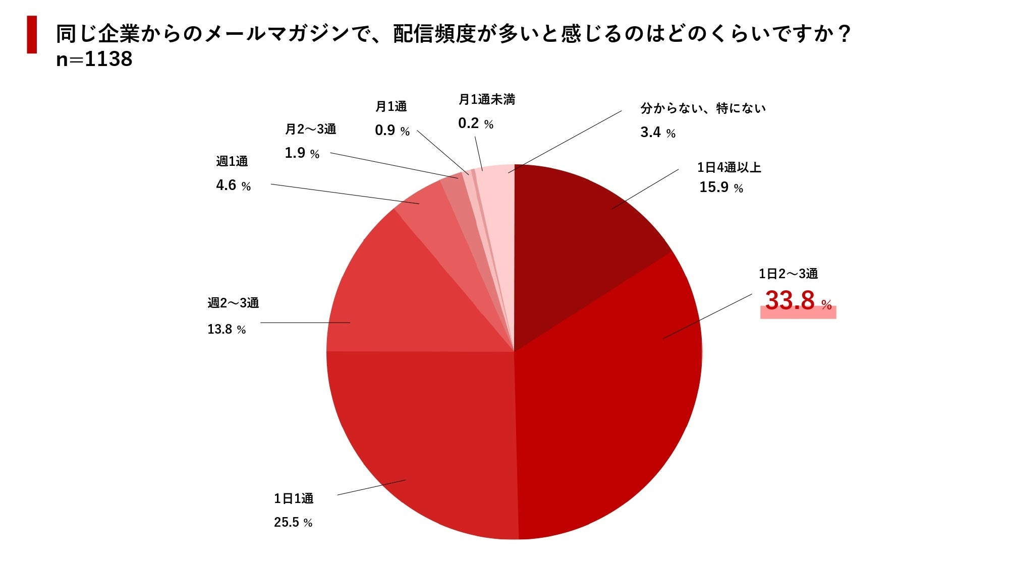 では、配信頻度が多いと判断するのは、どの程度なのでしょうか。アンケート結果を見ると、1日2~3通以上の配信に対して「多い」と感じるユーザーが全体の33.8%にのぼりました。次いで、1日1通の配信に対して「多い」と感じるユーザーが25.5%でした。どれだけ伝えたい情報があったとしても、配信頻度は1日1通までに抑えるべきだと考えたほうがよいでしょう。(2024年5月29日更新)