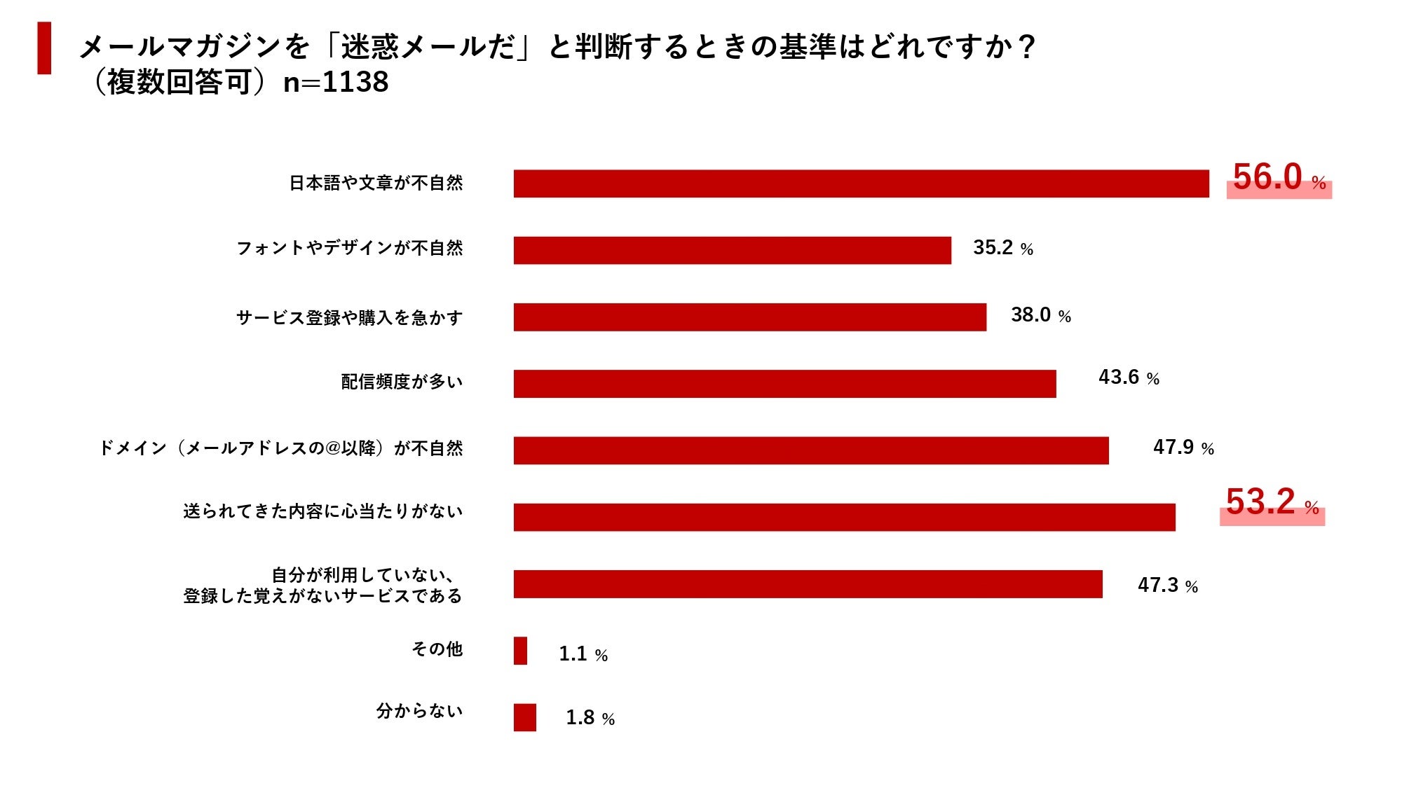 配信頻度に関しては、迷惑メールだと判断する基準でも43.6%と高い数値になっています。「送られてきた内容に心当たりがない」「登録した覚えがない」などオプトインに関する項目にも票が集まっているため、配信頻度とオプトインの分かりやすさについては徹底的に注意するべきだということが分かります。