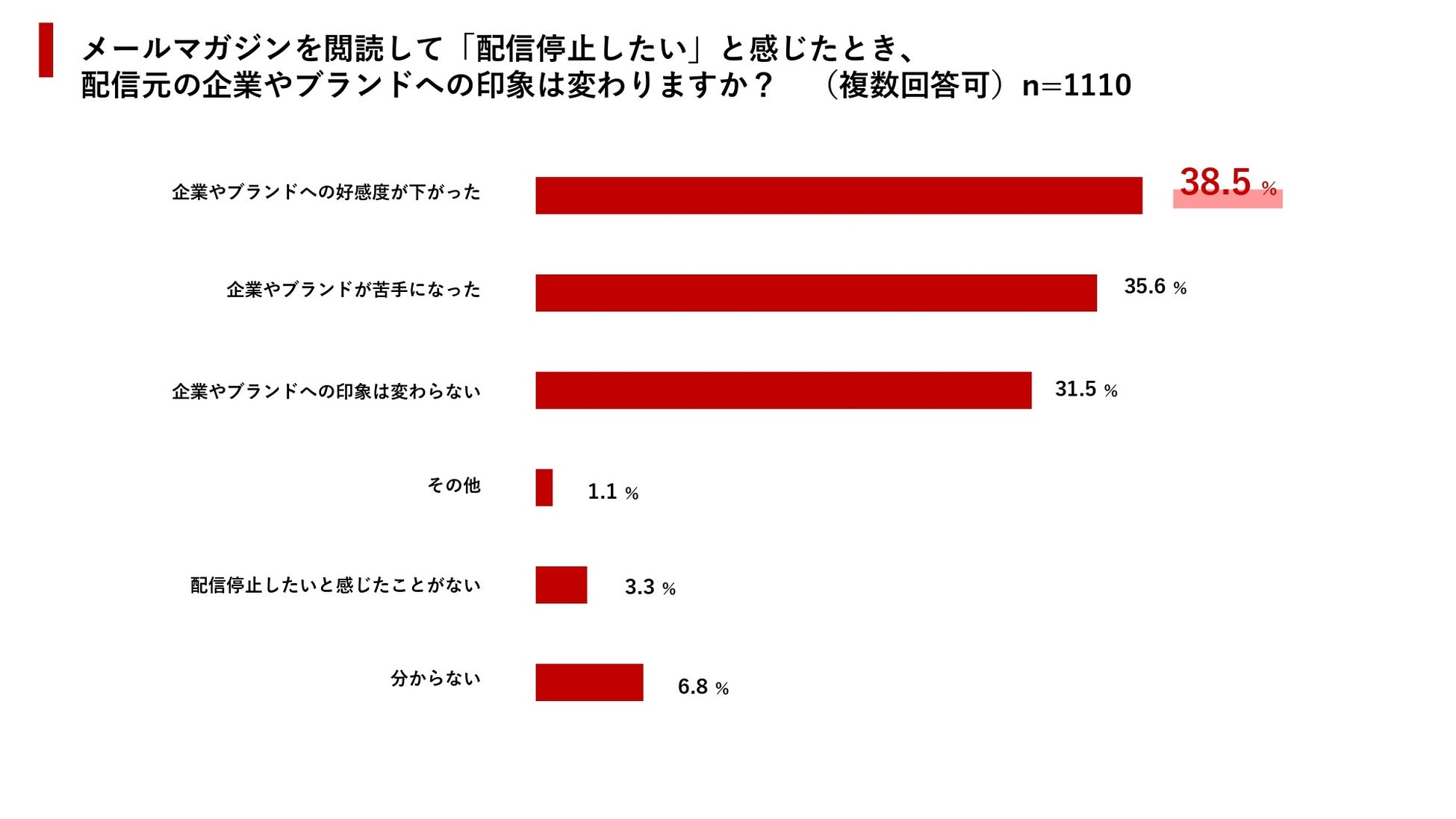 メールマガジンを配信停止したい(迷惑メールフォルダに入れる・報告する)と思われることは単にメールマガジンの効果が下がるだけではなく、ブランドイメージの毀損につながることもあります。アンケート結果を見ると、配信停止したいと感じたユーザーの40%近くが企業やブランドへの好感度が下がったと回答しています。