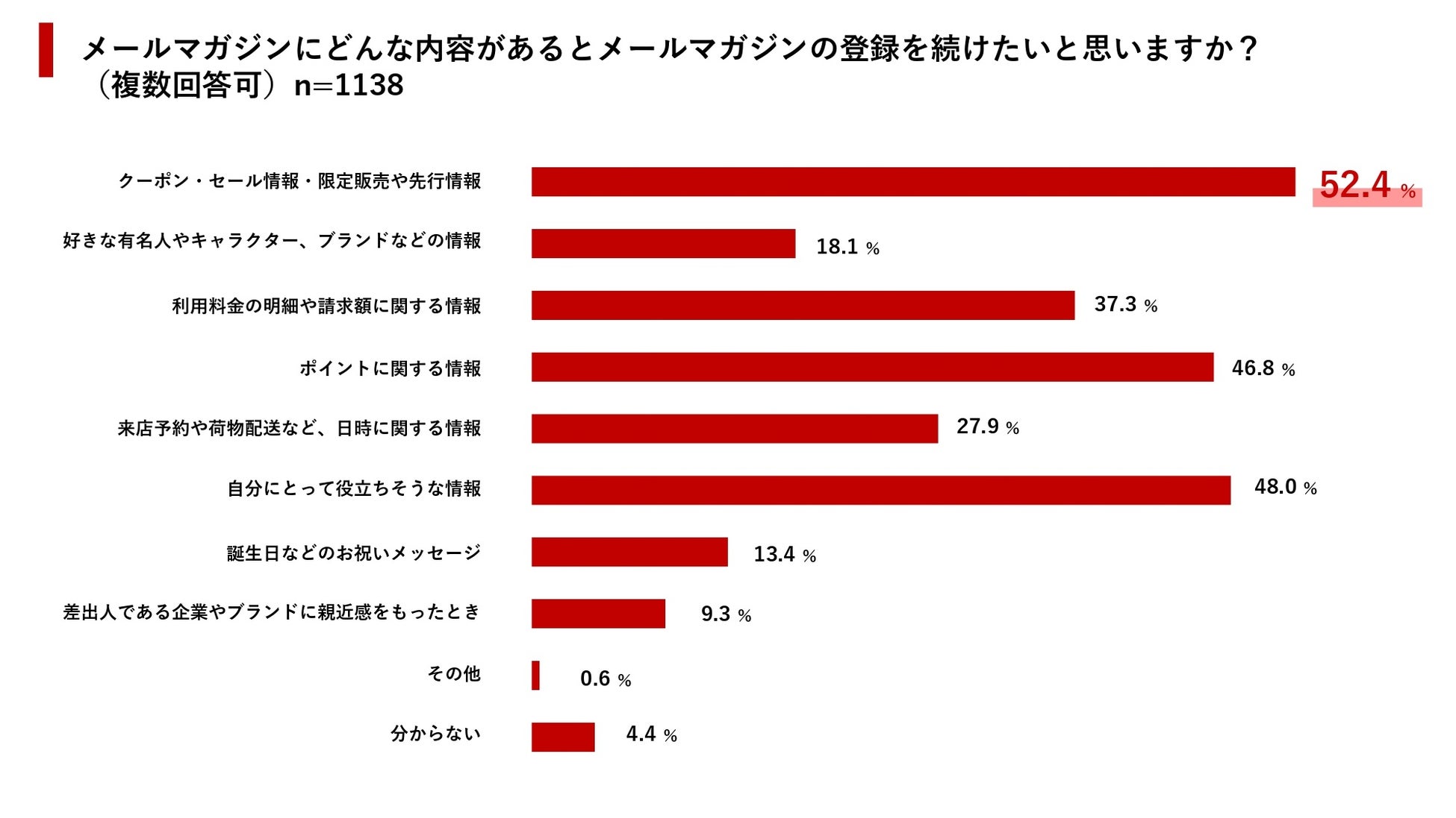 登録を続けたい内容としては、「クーポン・セール情報・限定販売や先行情報」が52.4%、「自分にとって役立ちそうな情報」が48.0%、「ポイントに関する情報」が46.8%となっており、ユーザーにとってメリットがある内容が好ましく思われていることが分かります。