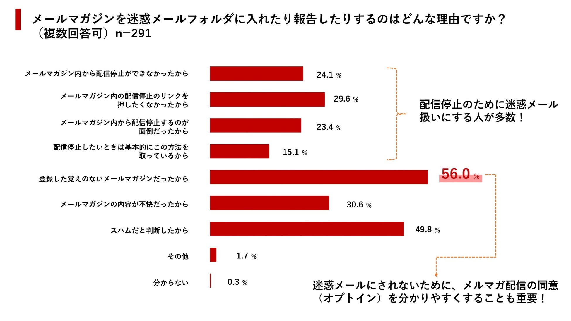 また、「登録した覚えがないメールマガジンだったから」という理由で迷惑メールフォルダに入れる・報告するユーザーもいることから、メールマガジンの迷惑メールフォルダ入り・報告を避けるためにはオプトイン・オプトアウトの分かりやすさが重要になってくることが読み取れます。