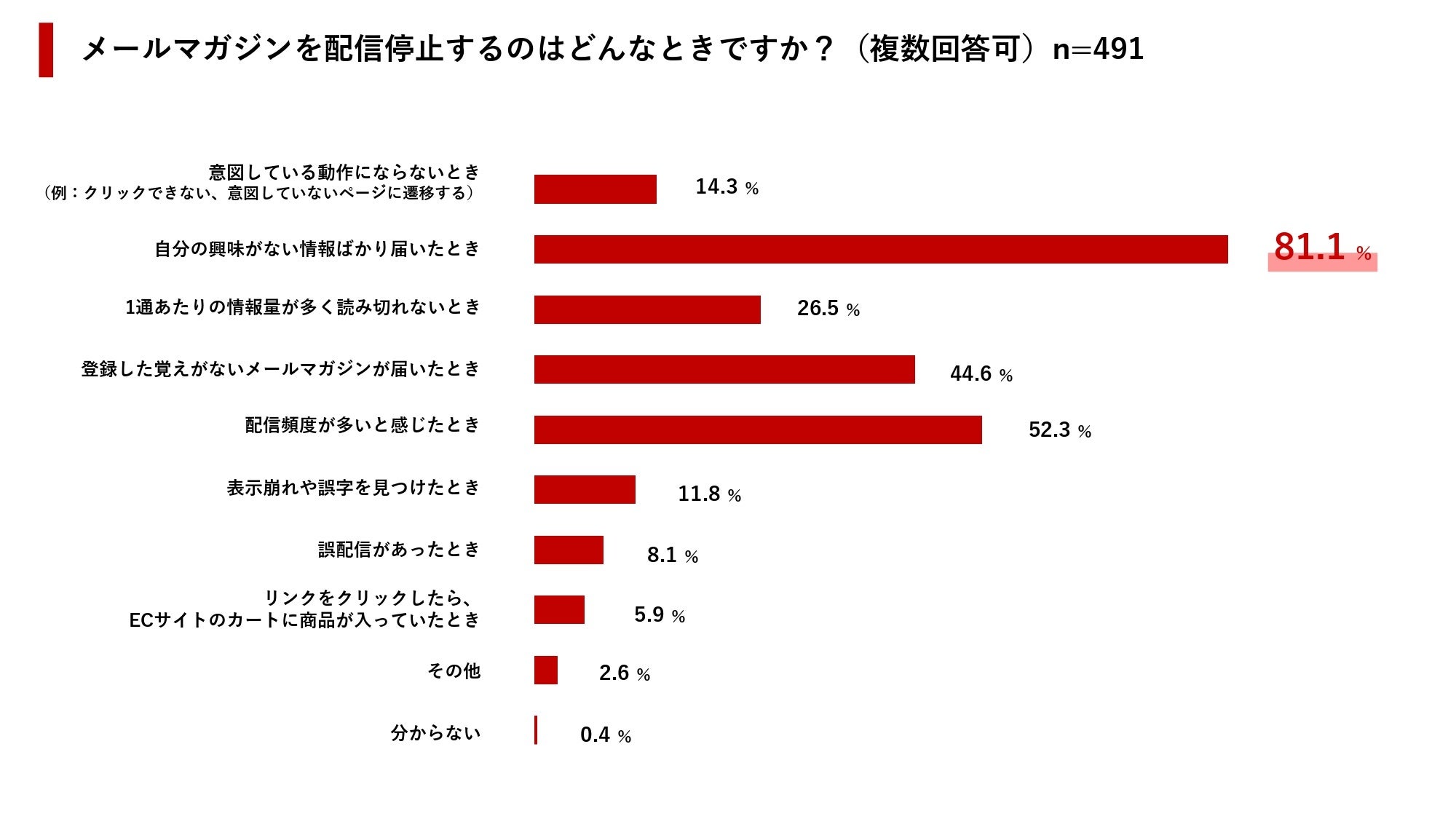 配信停止の理由として最も高かったのは「自分の興味がない情報ばかり届いたとき」で81.1%、次いで「配信頻度が多いと感じたとき」が52.3%となっています。