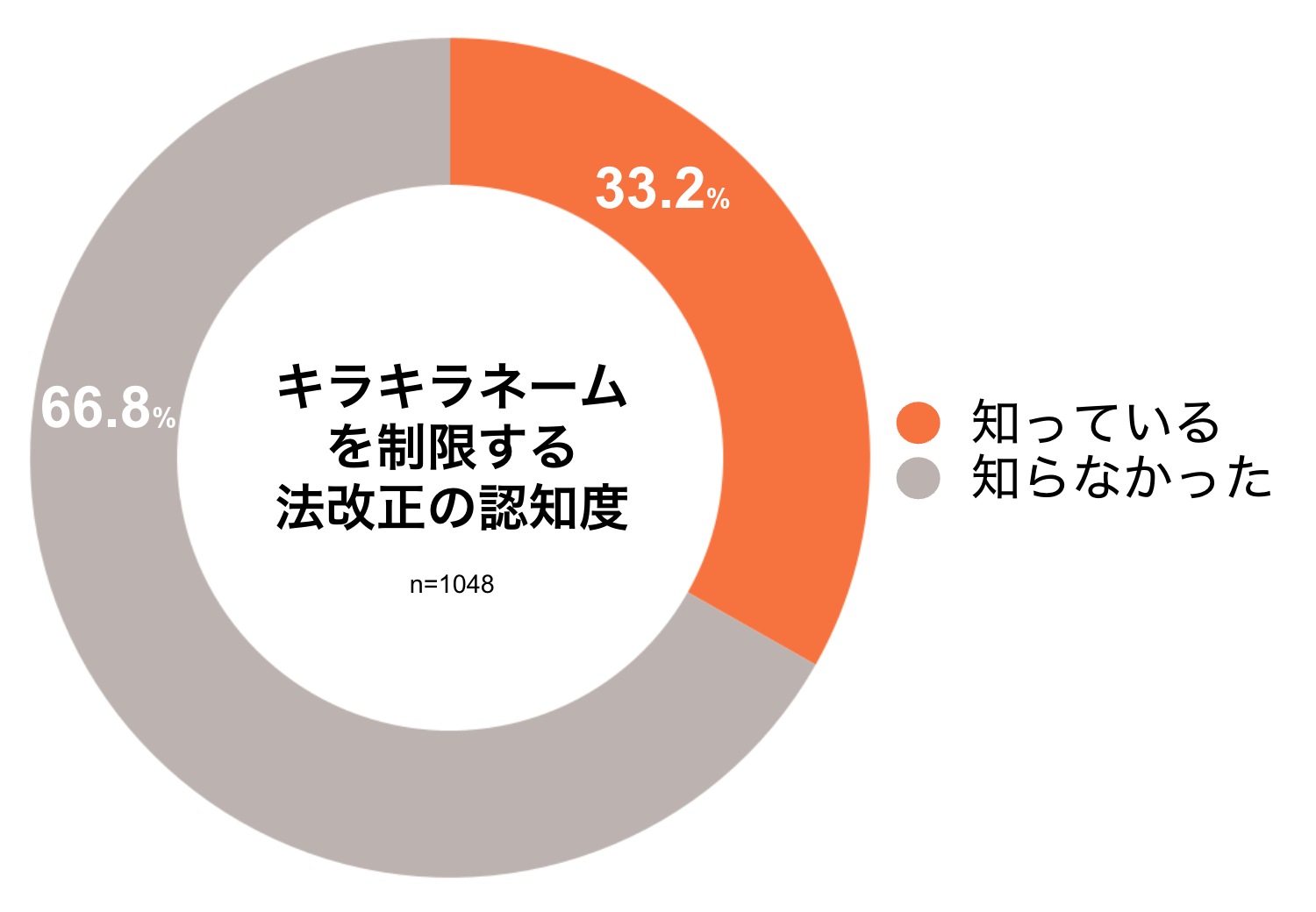 今回の法改正について知っているか(法改正で「キラキラネーム」の制限が強化されることを知っていましたか)を尋ねたところ、66.8%が「知らなかった」と回答し、「知っている」と回答した33.2%を大きく上回り、法改正が認知されていない実態が浮き彫りになりました。