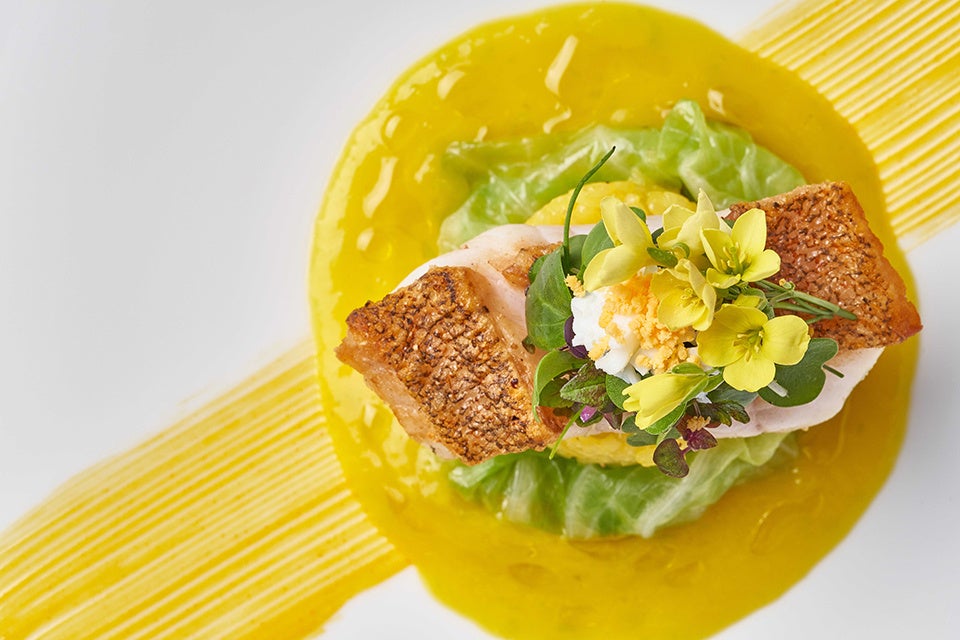 皮をカリっとオーブンで焼いたキジハタに、爽やかな香り漂う黄金のサフランリゾット、ソテーしたキャベツと貝の出し汁を合わせたソースを重ねました。
