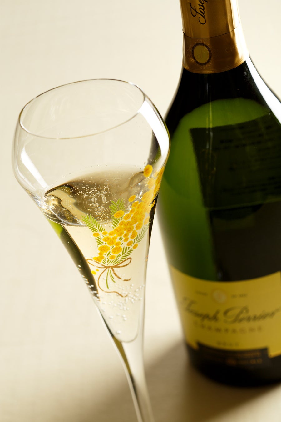 フランスで春先に花を咲かせるミモザは春を告げる花と言われており、毎年フランス各地では黄色いミモザの花を投げ合い、フラワーパレードが練り歩く「ミモザ祭り」が催されています。また、イタリアでは3月8日の「国際女性デー」が「ミモザの日」と呼ばれ、男性が女性にミモザの花を贈るのがならわしです。同店ではこの特別な日をお祝いして、ミモザの花が散りばめられたお料理に、シャンパン(ジョセフ・ペリエシリーズ)3種の中から「キュヴェ・ロワイヤル ブリュット」のフリーフロー、「マグナム トゥ・ド・ブラン エクストラ・ブリュット」と「キュヴェ ジョセフィーヌ」のグラス各1杯がお楽しみいただけるマリアージュコースをご用意いたしました。