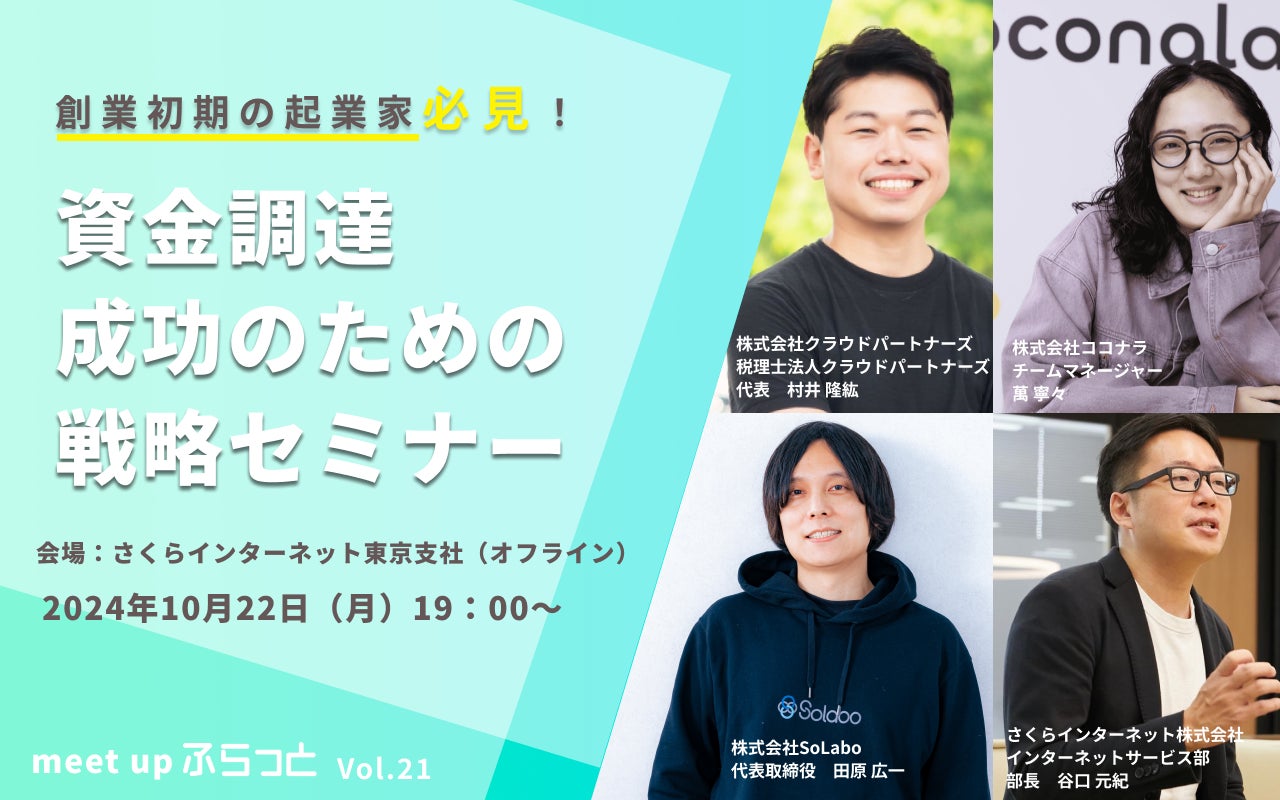 株式会社SoLabo(本社:東京都千代田区、代表取締役:田原 広一)が運営する、税理士・会計士コミュニティふらっとは、さくらインターネット株式会社(本社:大阪府大阪市北区、インターネットサービス部 部長:谷口 元紀)と、株式会社ココナラ(本社:東京都渋谷区、チーフマネージャー:萬 寧々)と株式会社クラウドパートナーズ(本社:東京都千代田区、CEO:村井隆紘)と共催で、資金調達に悩んでいる創業初期の企業家と税理士・会計士向けのセミナーを開催します。