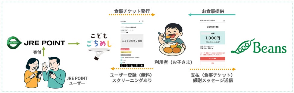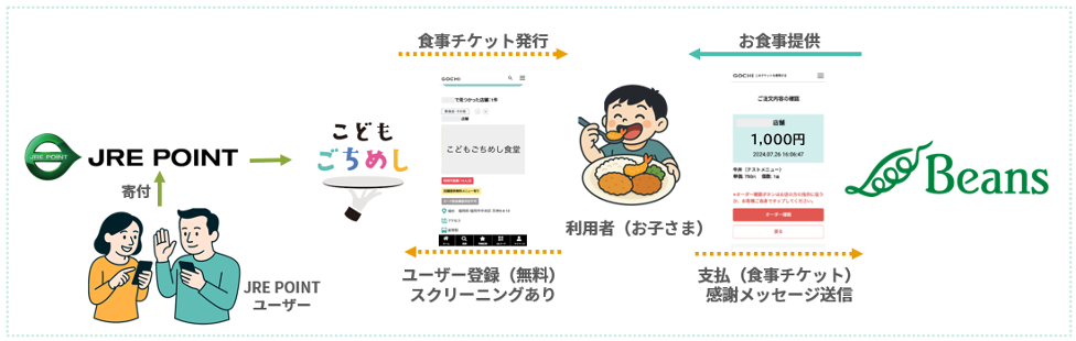 JRE POINT会員さまより寄付いただいたポイントはGigiの提供する「GOCHIプラットフォーム」により食事チケット化されます。「こどもごちめし」にて会員登録をされたお子さまは、ビーンズ武蔵中原の指定店舗にてお食事をし、お支払い場面にて食事チケットの提示をしていただきます。