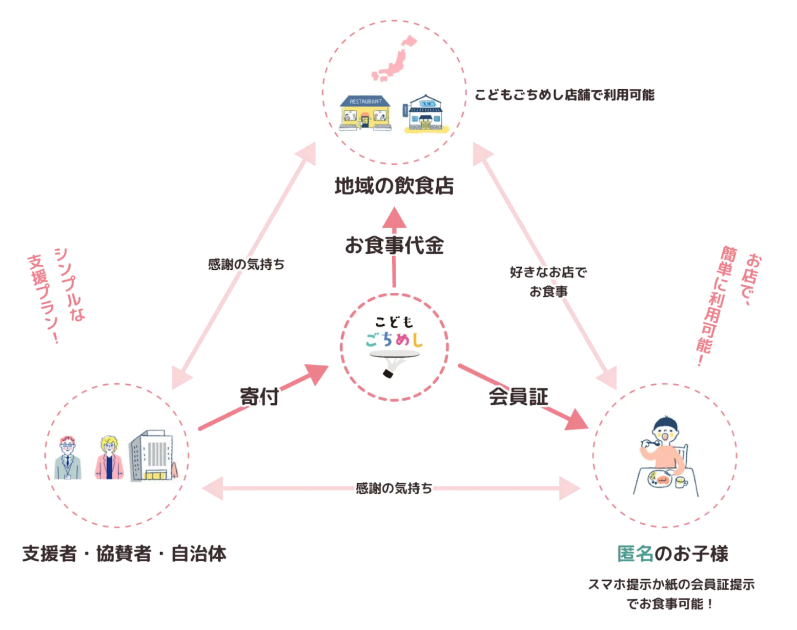 「こどもごちめし」「社食ごちめし」などを通じて、人とお店と地域にやさしい仕組みを実現し、ペイフォワードの想いが社会に循環する新しい価値観を創造していきます。