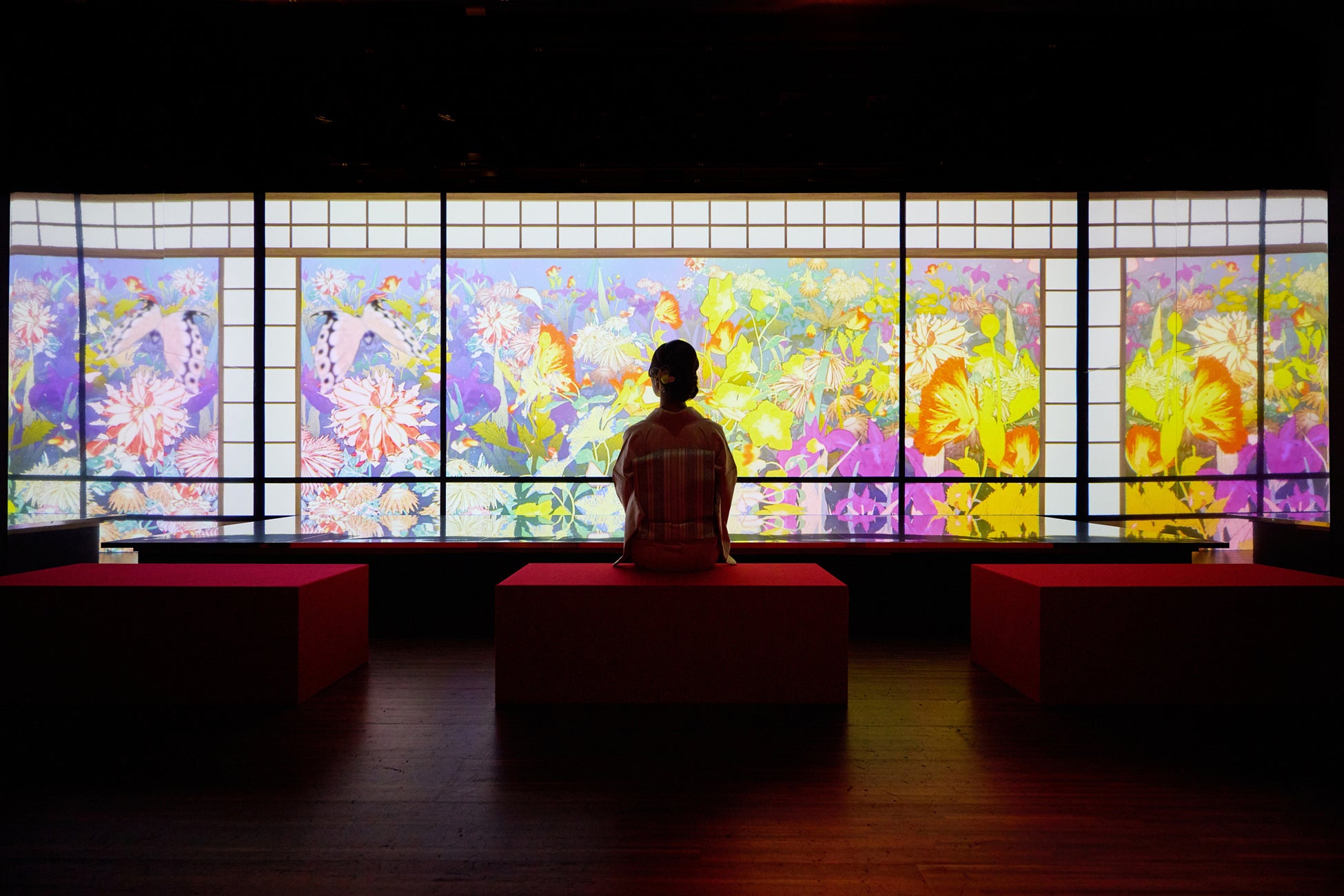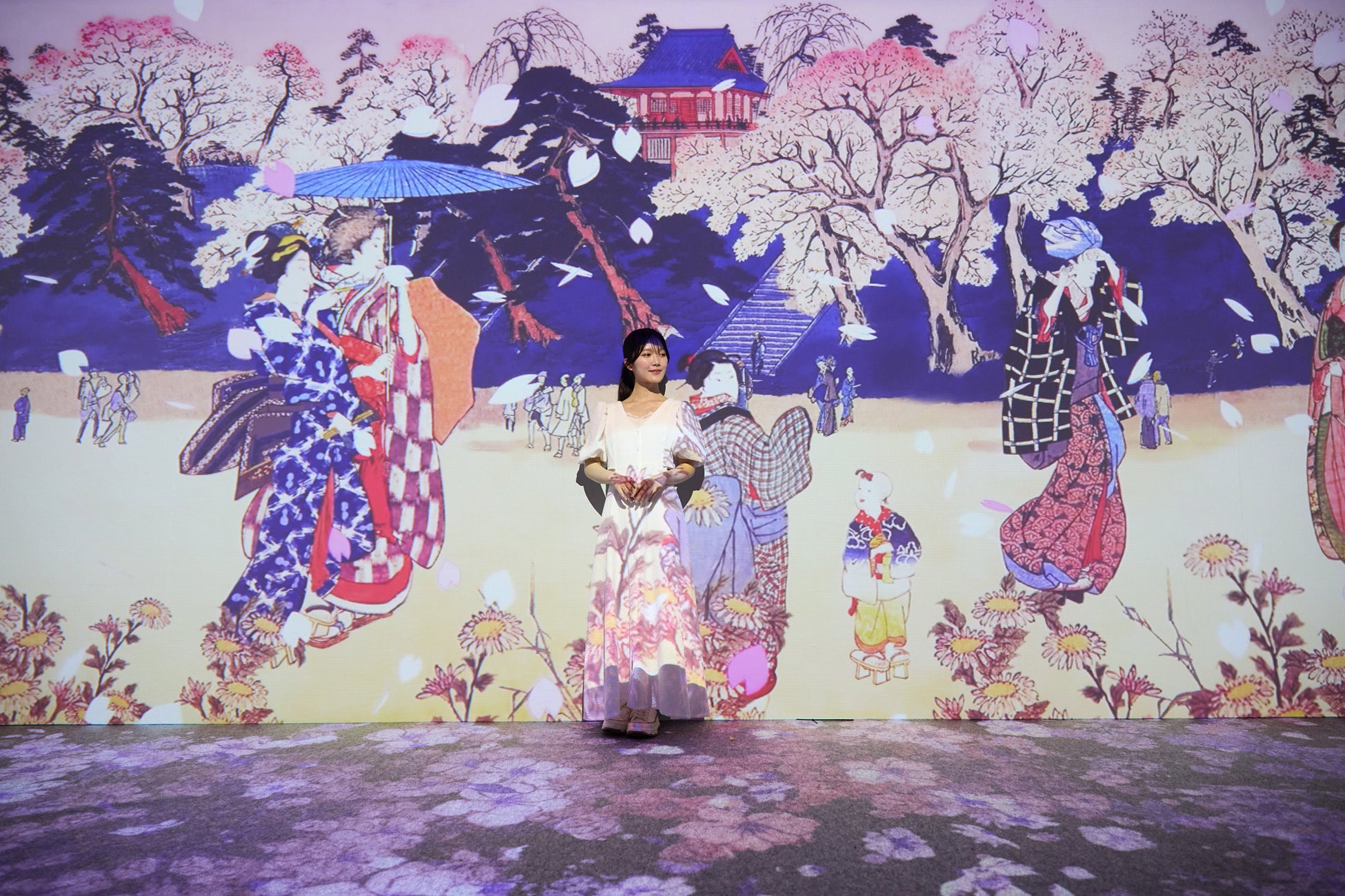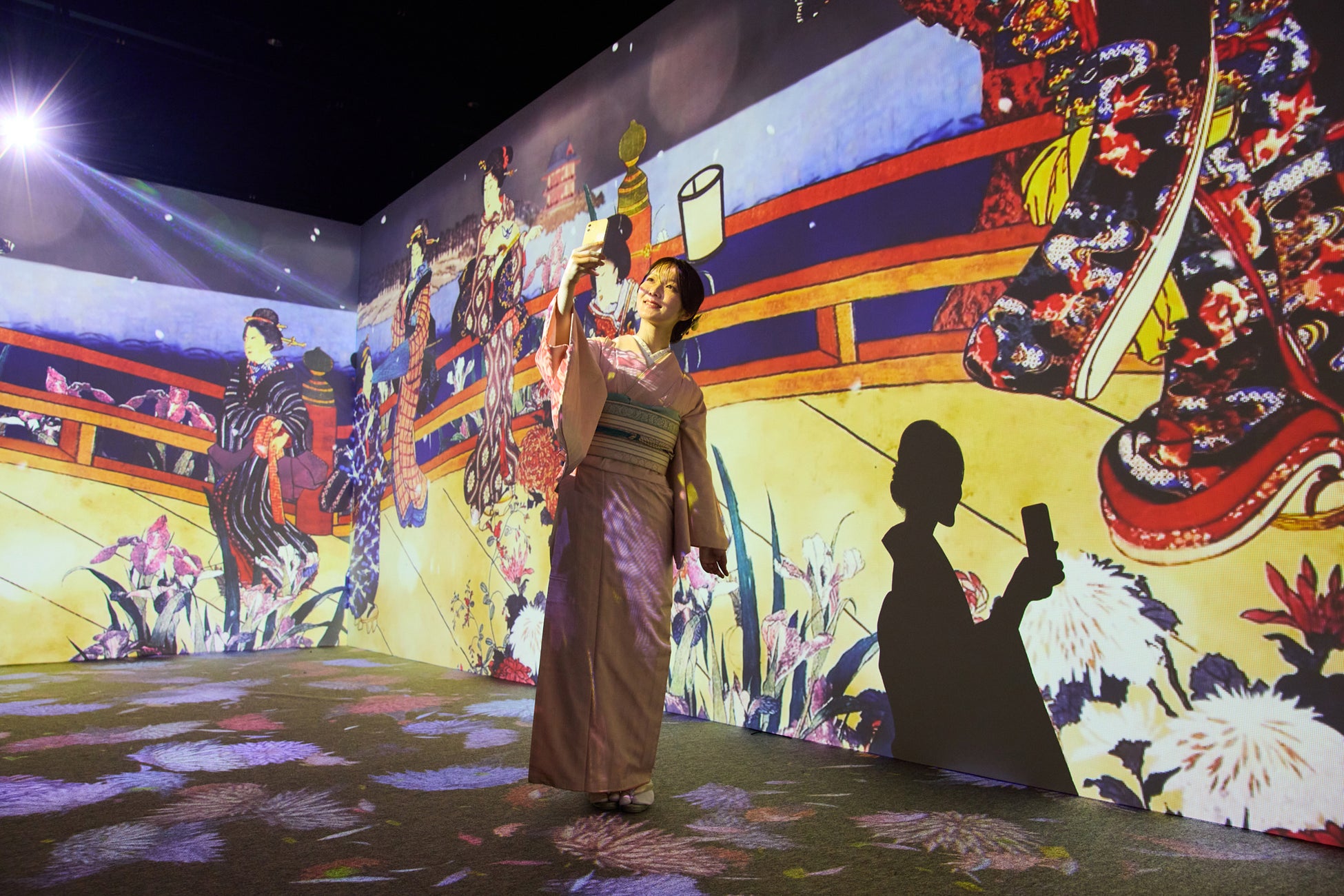 統と現代が融合する会場では、美しい着物をまとってデジタル映像と合わせて写真を撮る