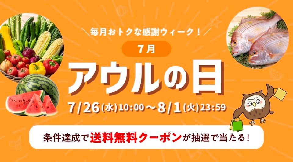 毎月おトクな感謝ウィーク「アウルの日」は先月初めて開催したところ、大変多くのお客様に好評いただきました。7月の「アウルの日」は7月26日(水)10:00から8月1日(火)23:59までのキャンペーン期間中、一律3,980円の限定目玉商品が50点以上出品されます。歯ごたえのある果肉と甘く溢れる果汁が特徴の特大玉スイカや、無農薬で育てた食べごろの旬野菜を11品詰め合わせた野菜セットなど、この期間だけのお求めやすい価格で登場します。