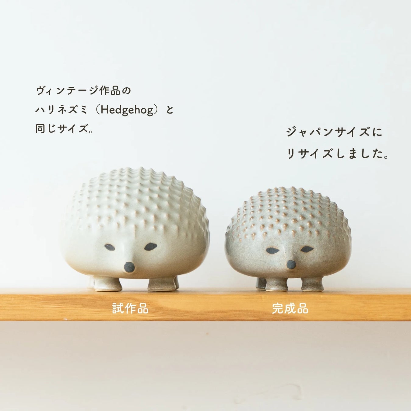 「益子焼」は、江戸時代の終わりからの歴史を持つ、栃木県益子町周辺の焼き物で、1950年代に日本を訪れたリサ・ラーソンは人間国宝・濱田庄司に出会い、ずっと魅せられていました。今回はその益子焼で、ヴィンテージ作品の「ハリネズミ」をジャパンサイズにリサイズし、リサが大好きな益子の釉薬「柿釉」を使った茶色と、新たに灰色を制作しました。