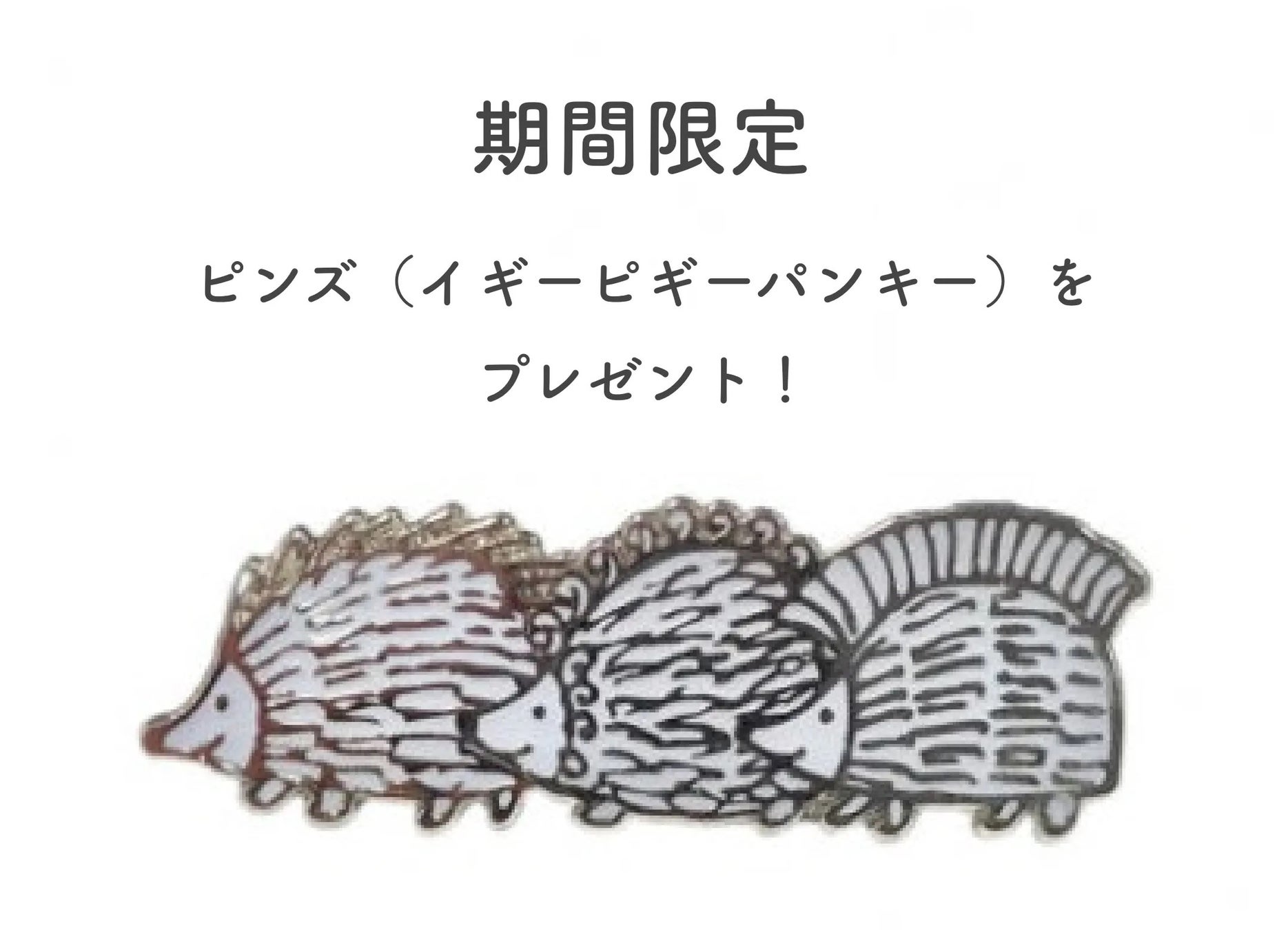 セットをご購入の方に、「ピンズ(イギーピギーパンキー)」をプレゼント!仲良しハリネズミ3兄弟が、仲良く歩く姿に癒されそうなピンズです!