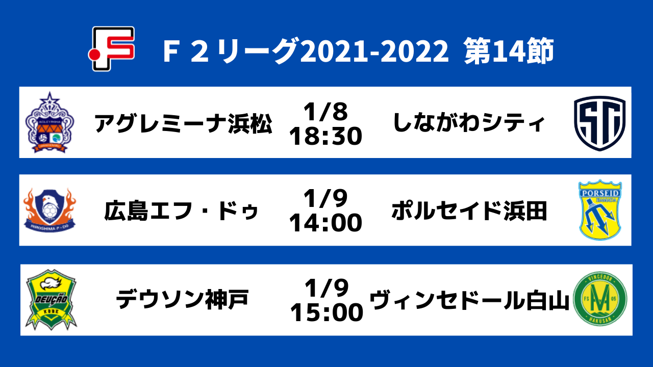 今季のF2リーグも残り2節。既にしながわシティがリーグ優勝を決めていますが、第13節終了時点で2位の広島エフ・ドゥが勝点22、3位のデウソン神戸、4位のヴィンセドール白山が勝点21と3チームがひしめき合っています。最終順位をひとつでも上で終えるために、どのチームも今節での勝利が絶対条件。各地で激戦が繰り広げられることが予想されます。得点ランキング上位の佐藤建也選手や白方秀和選手(ともにしながわ)、三上優貴選手(白山)、佐々木諒選手(広島)がどこまでゴール数を伸ばすかにも注目です。