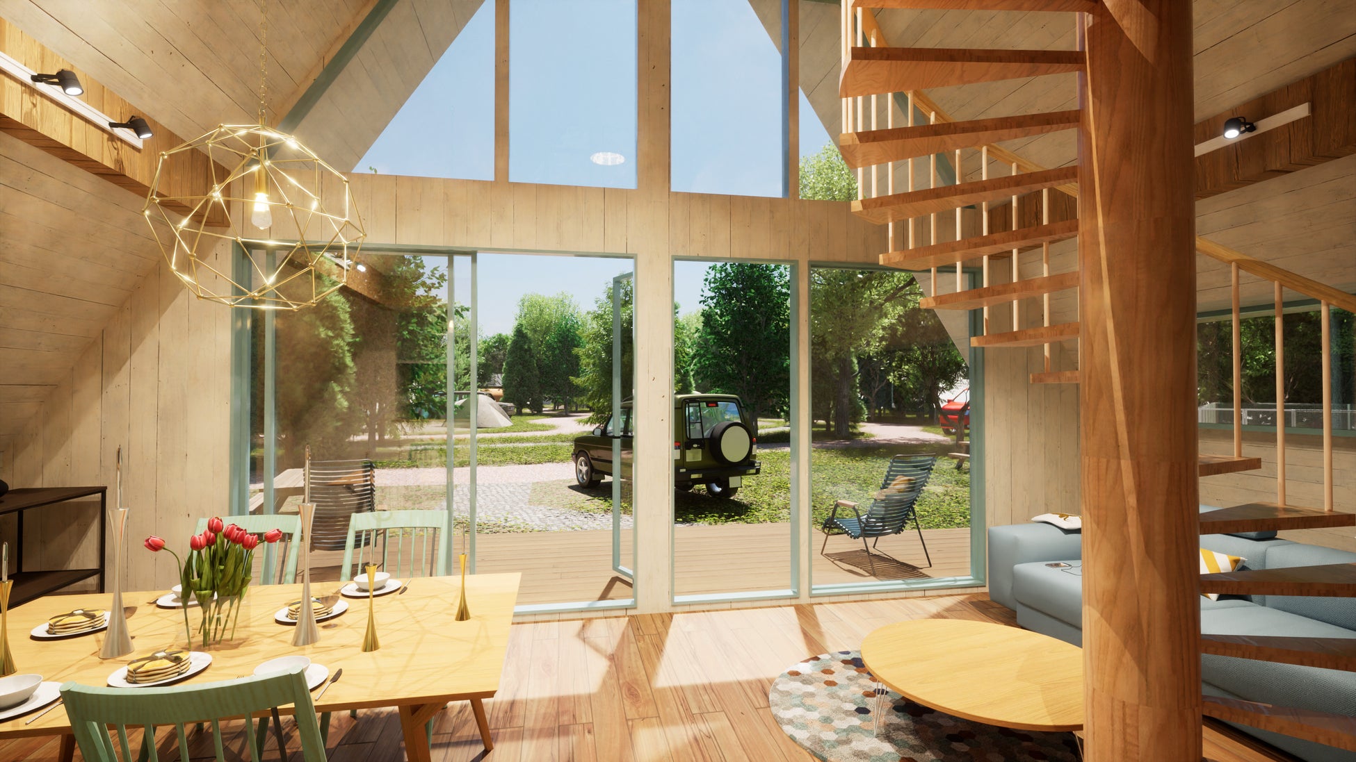 木々に囲まれたグランピングコテージは三角屋根の開放的な室内スペース。
