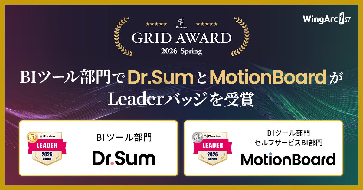 ウイングアーク1st株式会社(本社:東京都港区、代表取締役 社長執行役員CEO:田中 潤)は、アイティクラウド株式会社が運営するB2B向けIT製品/SaaSのレビュープラットフォーム「ITreview」が発表した「ITreview Grid Award 2026 Spring」の BIツール部門において、データマネジメント基盤「Dr.Sum」とデータアプリ基盤「MotionBoard」が、認知度・満足度が共に高く評価されている製品 として「Leader」を受賞したことをお知らせします。