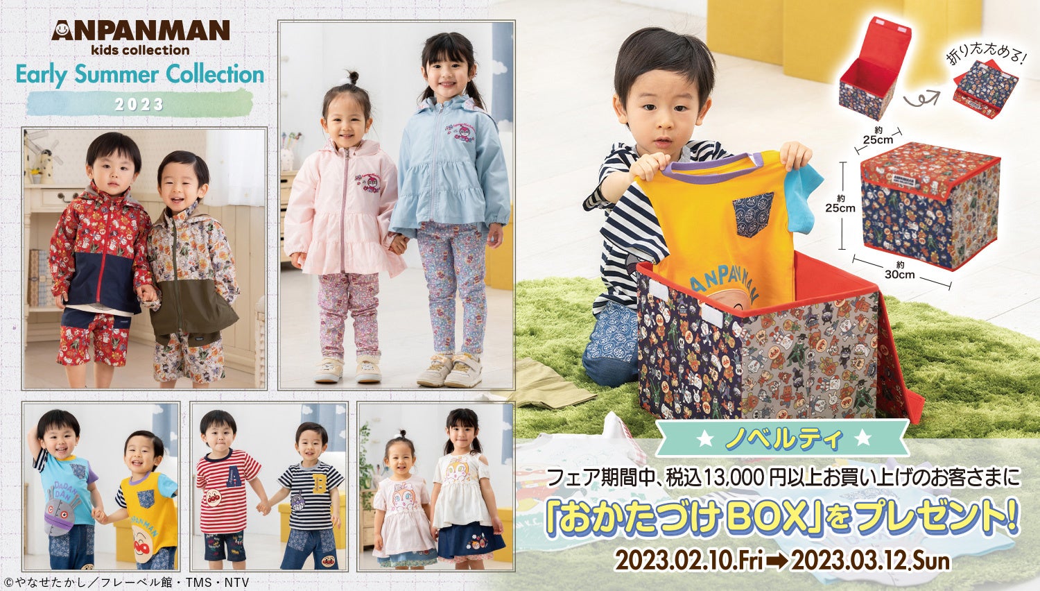 2023年2月10日(金)~2023年3月12日(日)の期間中、店頭およびバンダイナムコグループ公式通販サイト「プレミアムバンダイ内アンパンマンキッズコレクションオンラインショップ」にて13,000円(税込)以上お買い上げのお客様には、「オリジナルおかたづけボックス」をプレゼント!