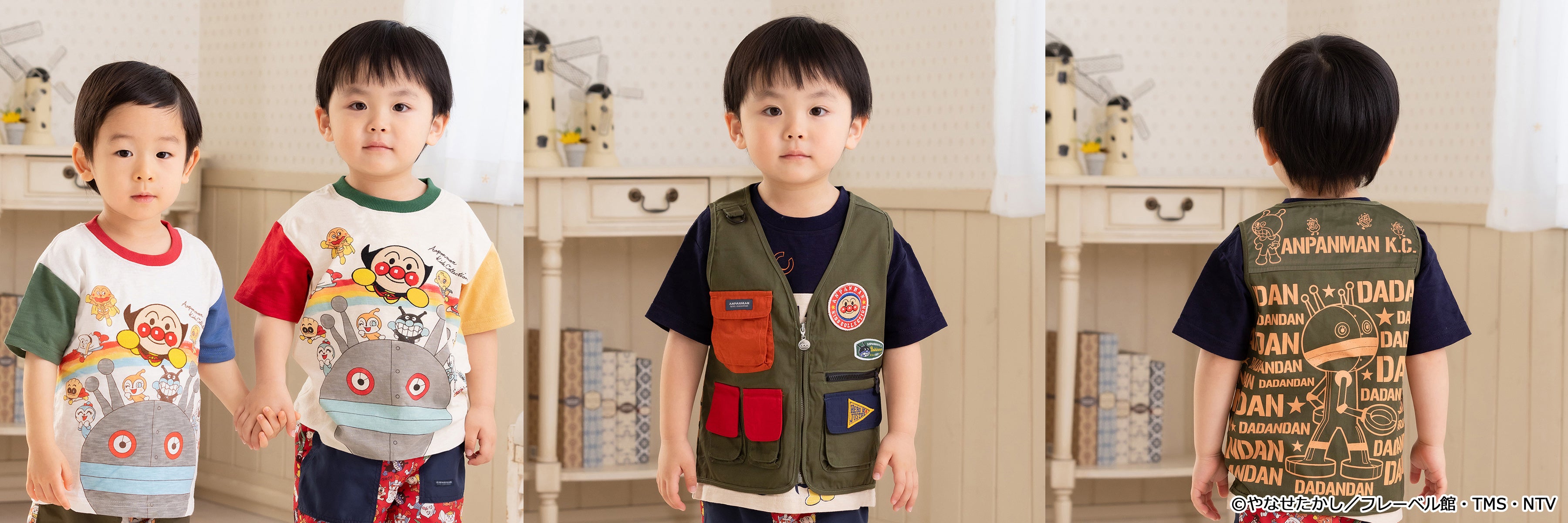 その他にも大きなだだんだんとたくさんの仲間たちがデザインされた『アンパンマン刺繍集合柄半袖Tシャツ(2月中旬~販売予定)』や、アウトドアの使用にもおすすめの『カラフルフィッシングベスト』などの展開もございます。