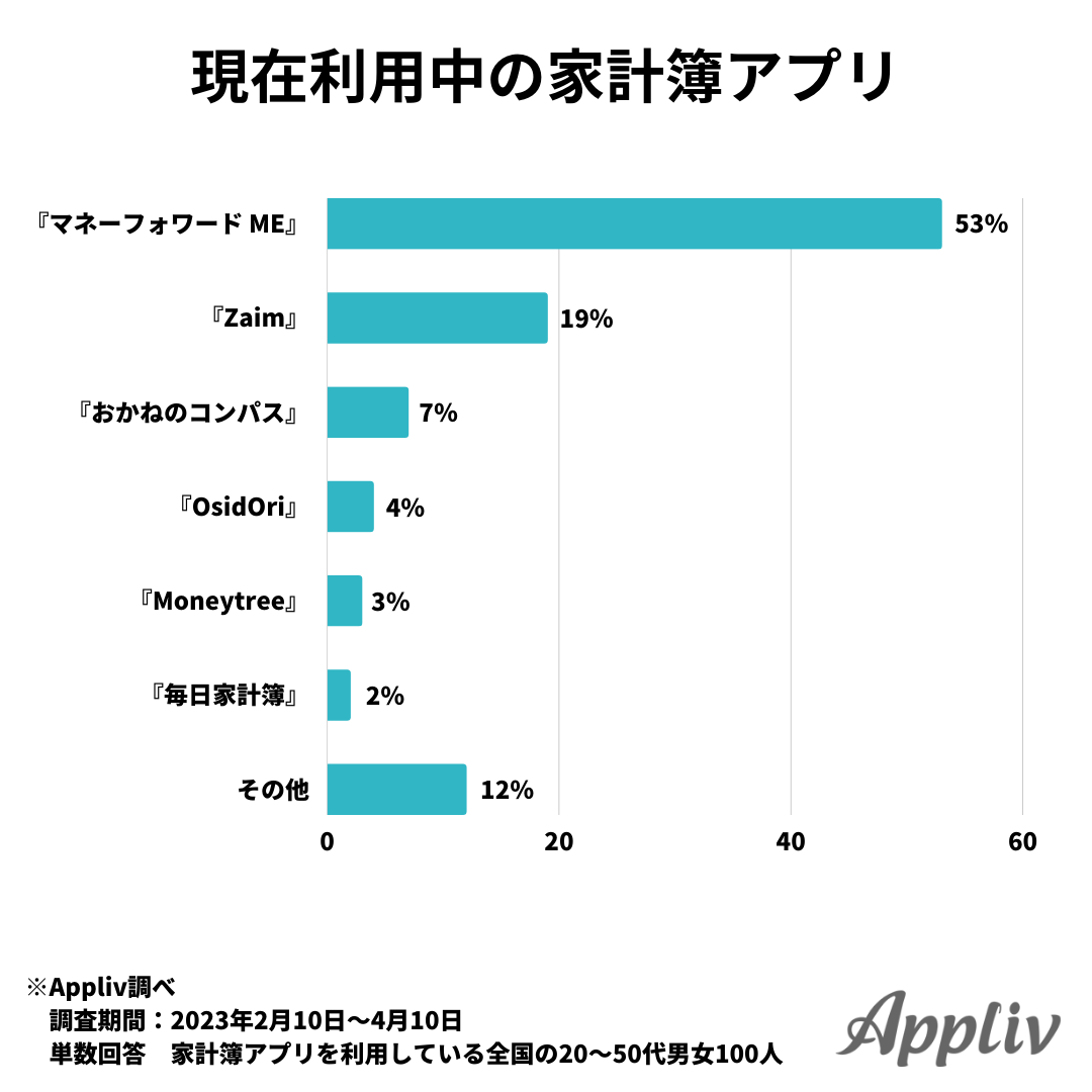 現在利用している家計簿アプリは、『マネーフォワード ME』が53%で1位。次いで『Zaim』が19%、『おかねのコンパス』が7%と続きます。