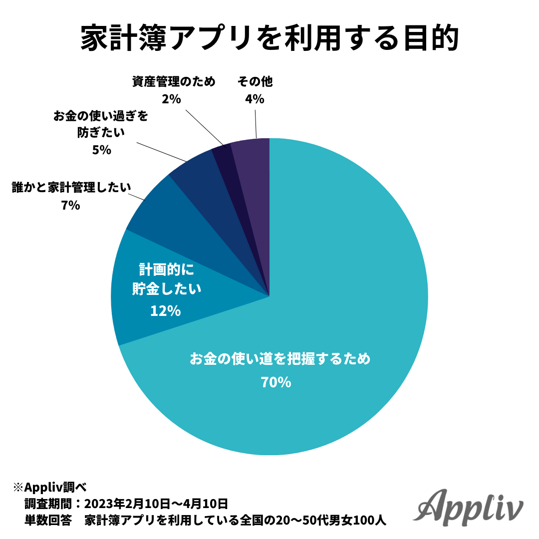 家計簿アプリ利用者100人に、利用目的について聞いてみた結果、70%が「お金の使い道を把握するため」と回答。続いて多かったのは「計画的に貯金したい」(12%)と「誰かと家計管理したい」(7%)と比べても大きな差があります。