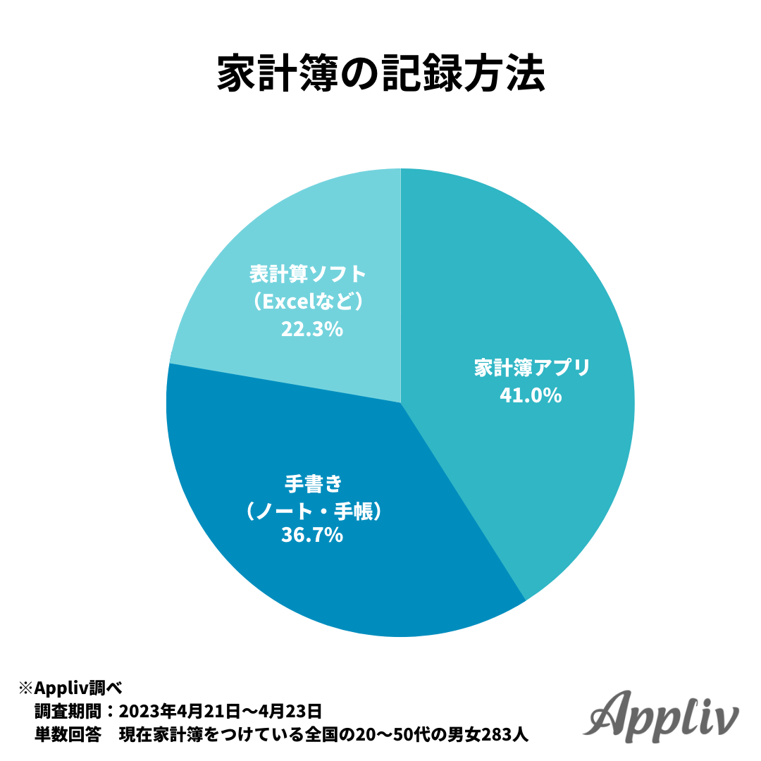 続いて、現在家計簿を利用中と回答した283人に、どのような方法で記録しているのか聞いたところ、最も多かったのは「家計簿アプリ」で41%となりました。2番目に多かったのは「手書き(ノート・手帳)」で36.7%、続いて「表計算ソフト」が22.3%です。