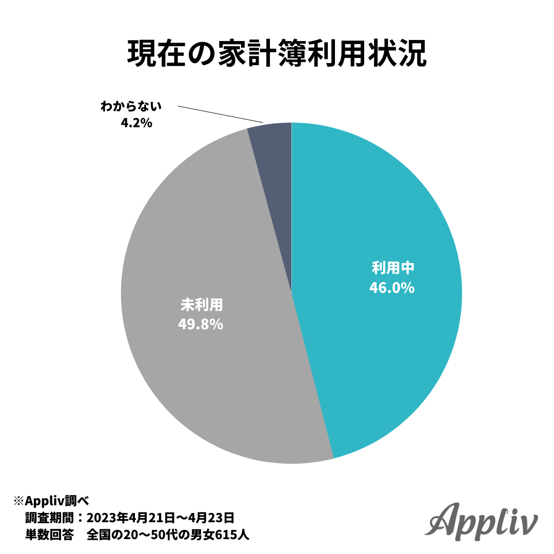 20代~50代の男女615人に、家計簿をつけているかをたずねた結果、現在利用中の人は46.0%でした。家計簿をつけていないと回答した人は49.8%で、利用中の人をわずかに上回っています。