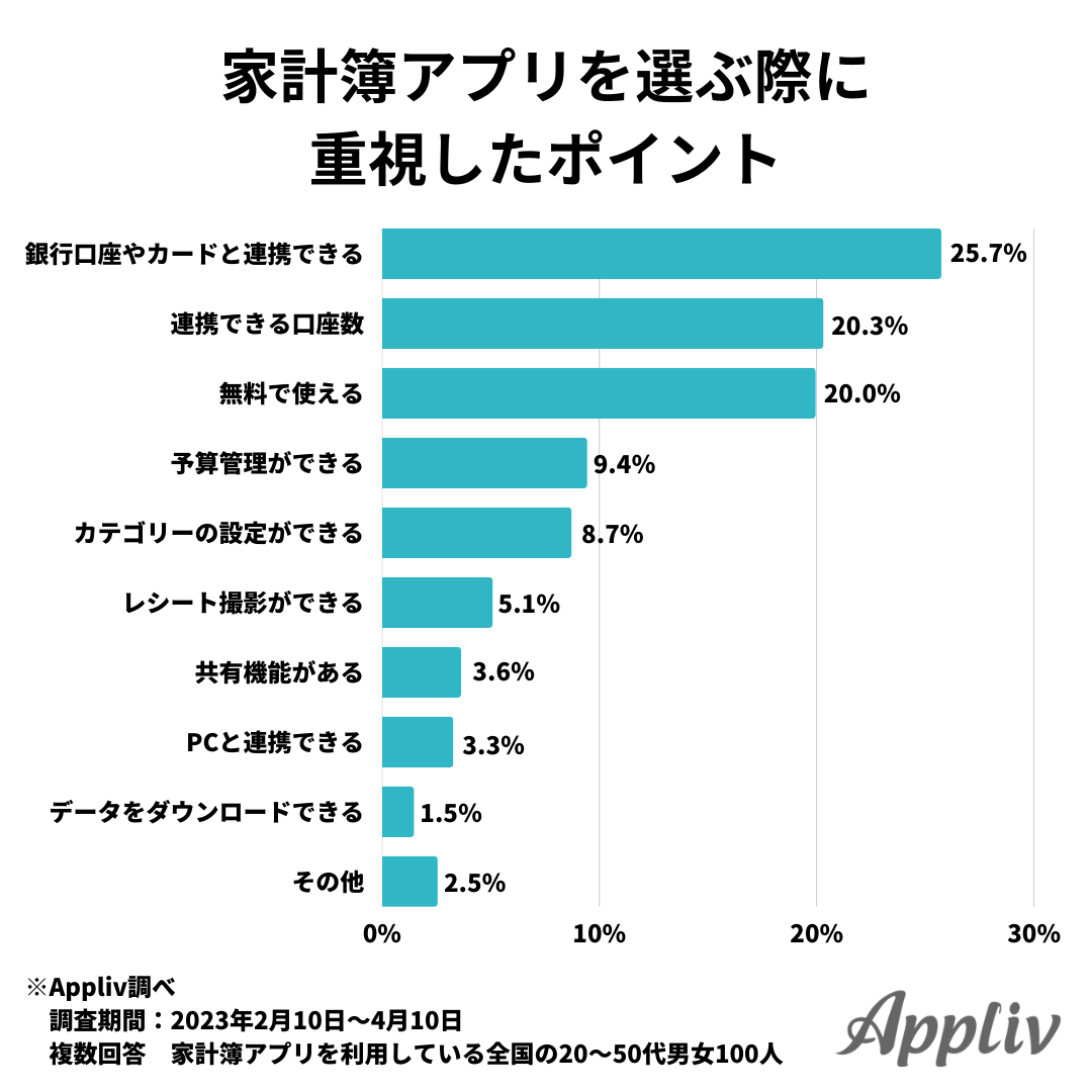 家計簿アプリ選びを選ぶ際に重視したポイントについて聞いたみたところ、「銀行口座やカードと連携できる」と回答した人が25.7%。続いて「連携できる口座数」と「無料で使える」が約20%となっており、多くのユーザーは連携機能に期待して家計簿アプリを選んでいるといえます。