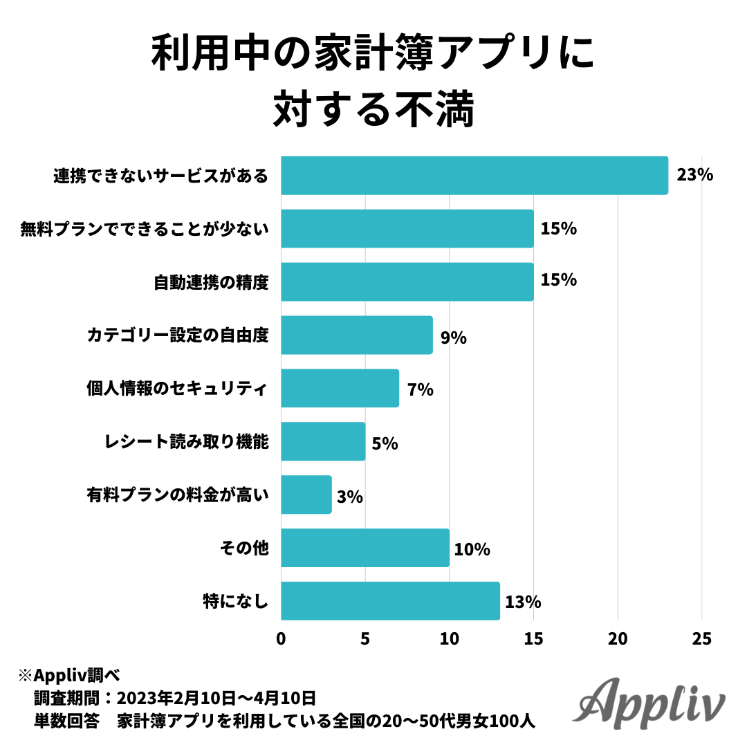連携機能が重視されているだけあってか、利用中の家計簿アプリに対する不満点も「連携できないサービスがある」がおよそ4分の1を占めました。次いで「無料プランでできることが少ない」「自動連携の精度」が15%と多くなっています。