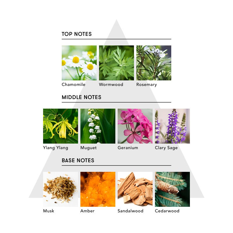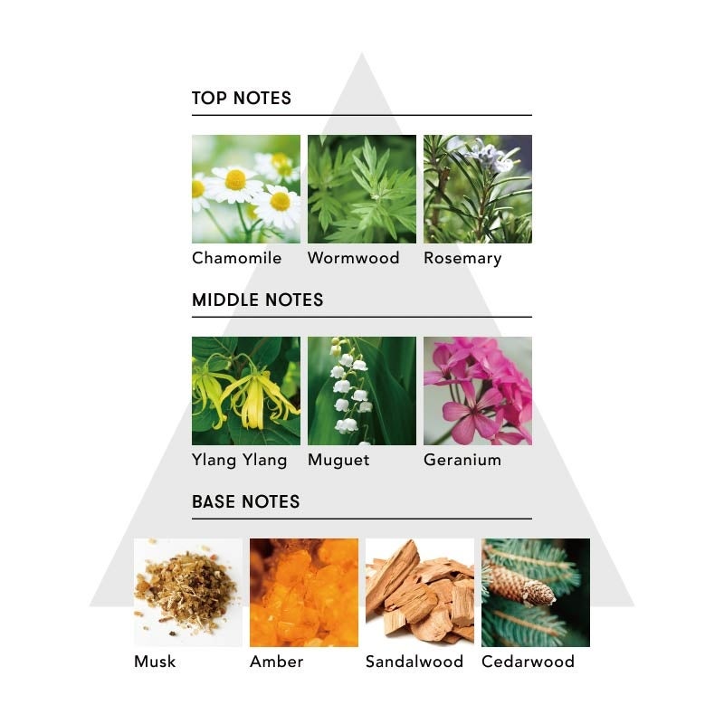 カモミールの柔らかな甘さとワームウッドのほのかな苦みが呼吸をそっと整え、気持ちを静かにほどいていく。ゼラニウムやクラリセージの静かな力が、ミュゲやフローラルの余韻と溶け合い、内側からやさしく満たされるような幸福感をもたらす。それは思考の波が静まり、まぶたの裏に穏やかな闇が広がっていくような感覚。目を閉じて、何も手放さず、何も求めずに、ただ深く休むこと。"The Lullaby"は、そんなやさしく穏やかな無音のひとときをくれる。