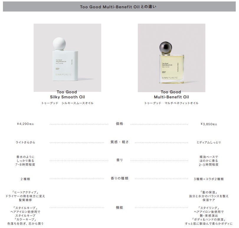 トゥーグッド シルキースムースオイル (全2種) 50mL 4,290円(税込)