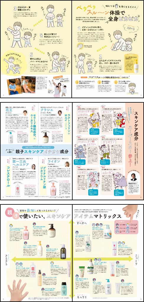 あんふぁん別冊「親子スキンケアBOOK」では、「親子で一緒に・楽しく乾燥ケア」をテーマに、子どもと大人の肌の知識にはじまり、効率的な塗り方、注目のスキンケア成分、親子で使える商品紹介と、ページを進みながら段階的に乾燥ケアのステップを踏める構成で紹介しています。なかでも、テクスチャー・仕上がり肌を基準に展開した16商品の分布図は注目です。
