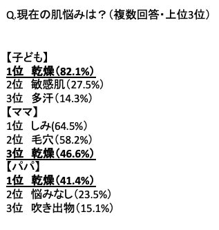 ママ・パパ・子どもとも肌悩みの上位が「乾燥」