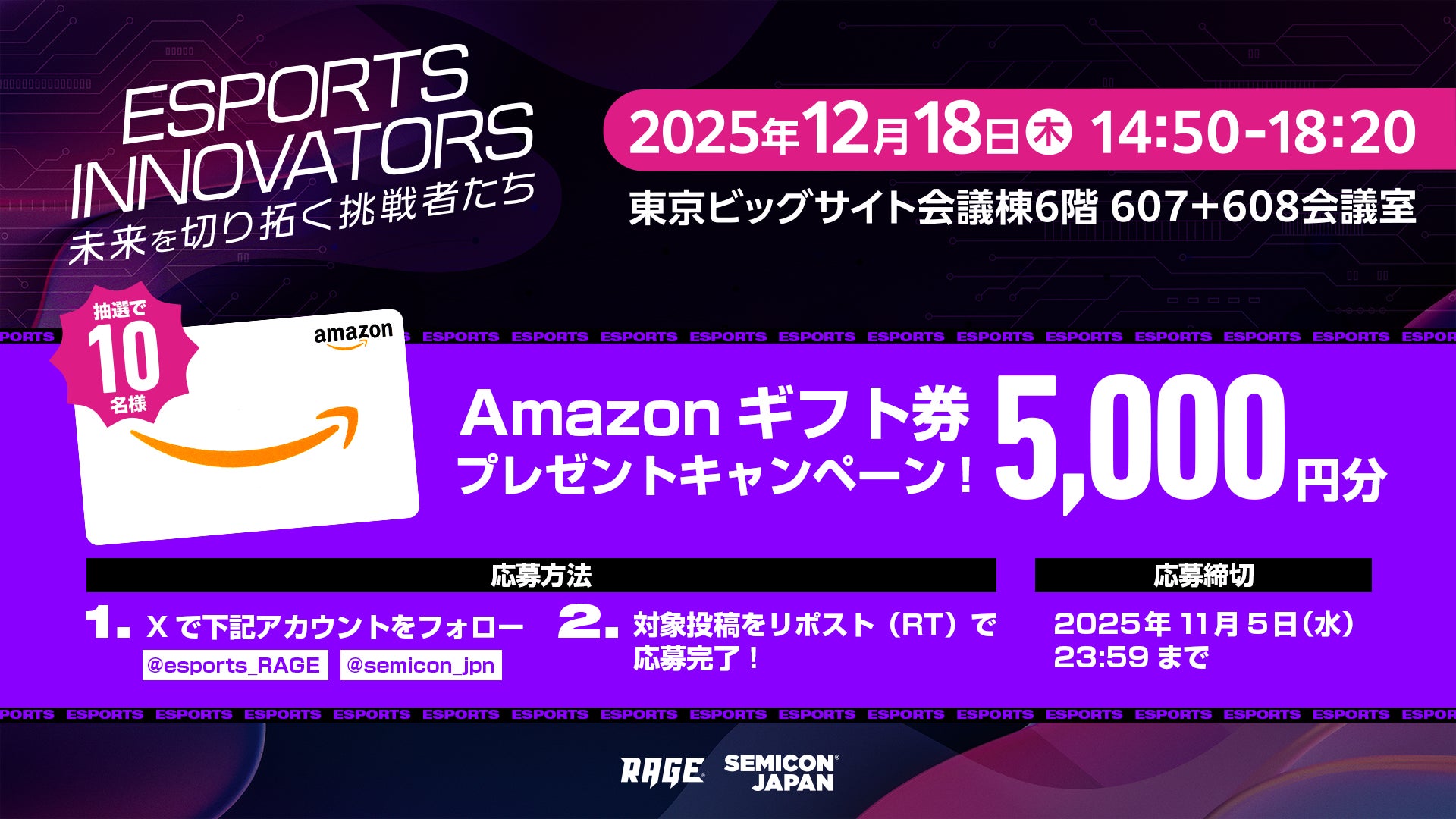 本企画の開催を記念し、RAGE公式Xアカウント(@esports_RAGE)では、SEMICON Japan 2025とのコラボプレゼントキャンペーンを実施中です。イベントの模様や最新情報も随時更新されますので、ぜひフォローの上ご参加ください。