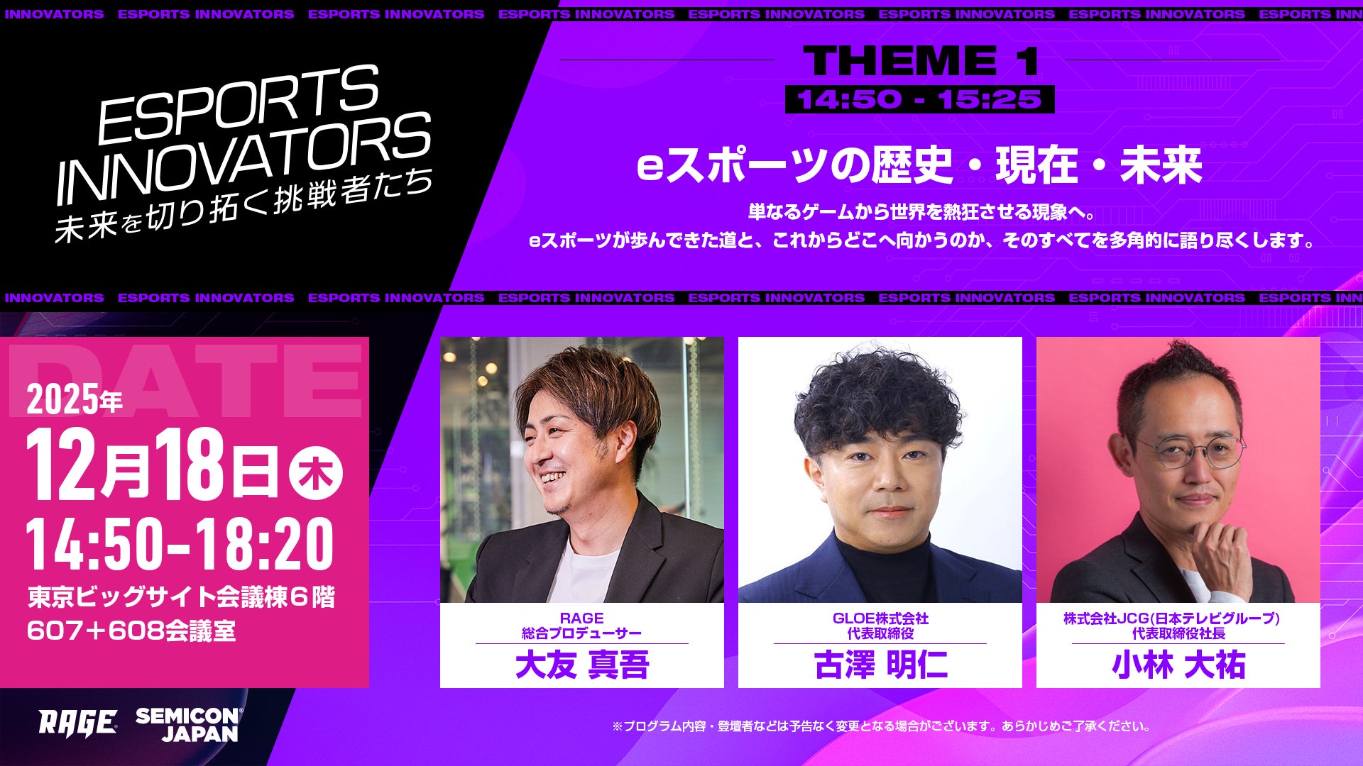 国内最大級のeスポーツイベント「RAGE(レイジ)」は、2025年12月18日(木)に東京ビッグサイトで開催される「SEMICON Japan 2025」特別企画「ESPORTS INNOVATORS ~未来を切り拓く挑戦者たち~」(主催:SEMI)において、イベント運営協力として参画することをお知らせいたします。