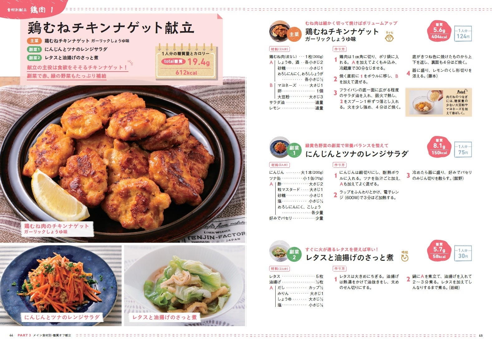 掲載しているすべてのおかずに糖質量、カロリー、食材費を記載。すべての献立がダイエットにうれしい糖質量内になるように計算されているから、そのままマネするだけでOK。鶏むね肉や豆腐などのお買得食材でできるおかずばかりなので食費削減にも効果があります。
