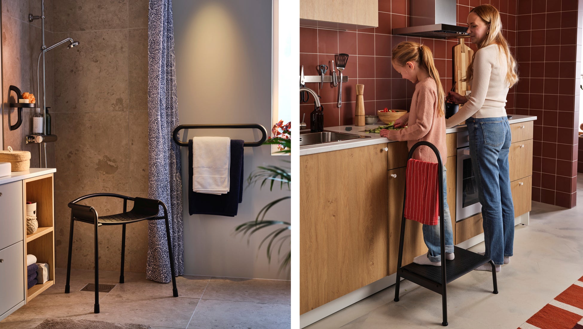 ハンドレール付きの2種類のステップスツールは、高い場所に簡単に手が届くようにデザインされ、さらに、ハンドレールは立ち上がる時のサポートとしても役立ちます。そして、滑りにくい素材の脚が付いた頑丈なシャワーチェアは、入浴時の快適さと安定性を提供します。さらに、トイレットペーパーホルダー、タオル掛け、シャワーシェルフも含まれており、それぞれがバスルームをはじめとした家でのさまざまなシーンの使い勝手を一段と向上させるようなデザインとなっています。本シリーズは、子どもから高齢者まで、誰でも簡単に使えるようデザインされ、家での暮らしに課題を抱えている人が家で自立して快適に暮らす助けとなることを目的として開発されています。