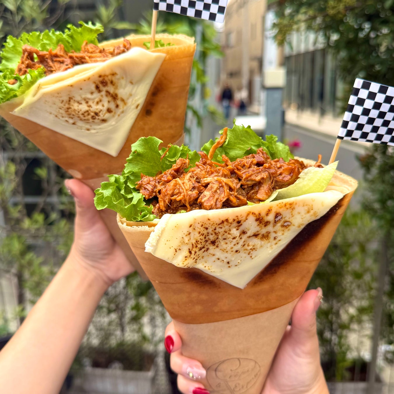表参道で話題の「クレープとエスプレッソと。」が、今年もフジニックに参戦!総フォロワー数11万人の車系インフルエンサー「AYAKA(@ayagram_8924)」監修によるS耐ファン必食の限定クレープ。たっぷりのプルドポークを、パリッと香ばしい黄金クレープに包みチーズとマヨネーズで仕上げたボリューム満点の“耐久応援フード”が登場!