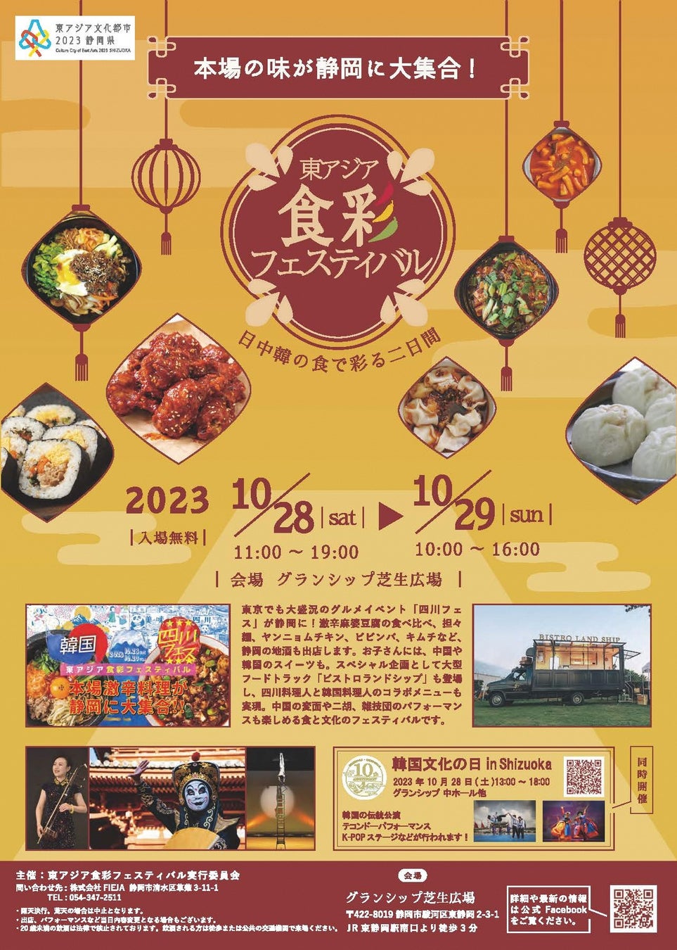 2023年10月28日(土)・29日(日)にグランシップ(東静岡駅南口すぐ)で『東アジア食彩フェスティバル』を開催。中国、韓国のグルメが大集結!入場無料。