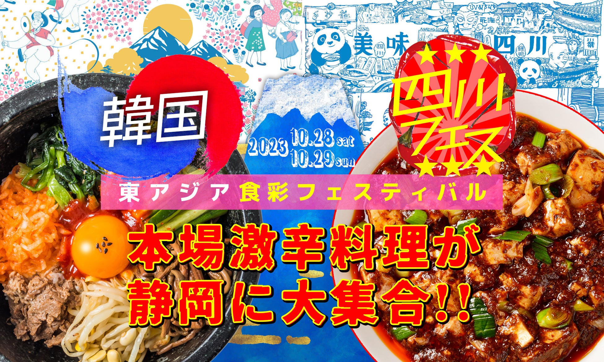 東京でも大人気の食フェス「四川フェス」と激辛料理専門家の金成姫さんのコラボが実現。麻辣グランプリ受賞店舗も続々出店し、静岡初開催。中国伝統芸能の変面、京劇、壺回しなど、雑技も無料で見られます。28日は韓国文化の日、テコンドーやK-POPも。