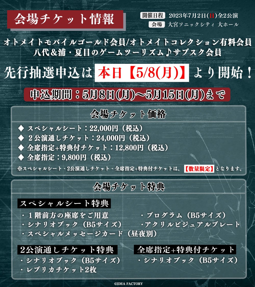 本日5月8日(月)より【オトメイトモバイルゴールド会員、オトメイトコレクション有料会員、八代&浦・夏目のゲームツーリズム♪サブスク会員】の先行抽選申込受付が開始いたしました!