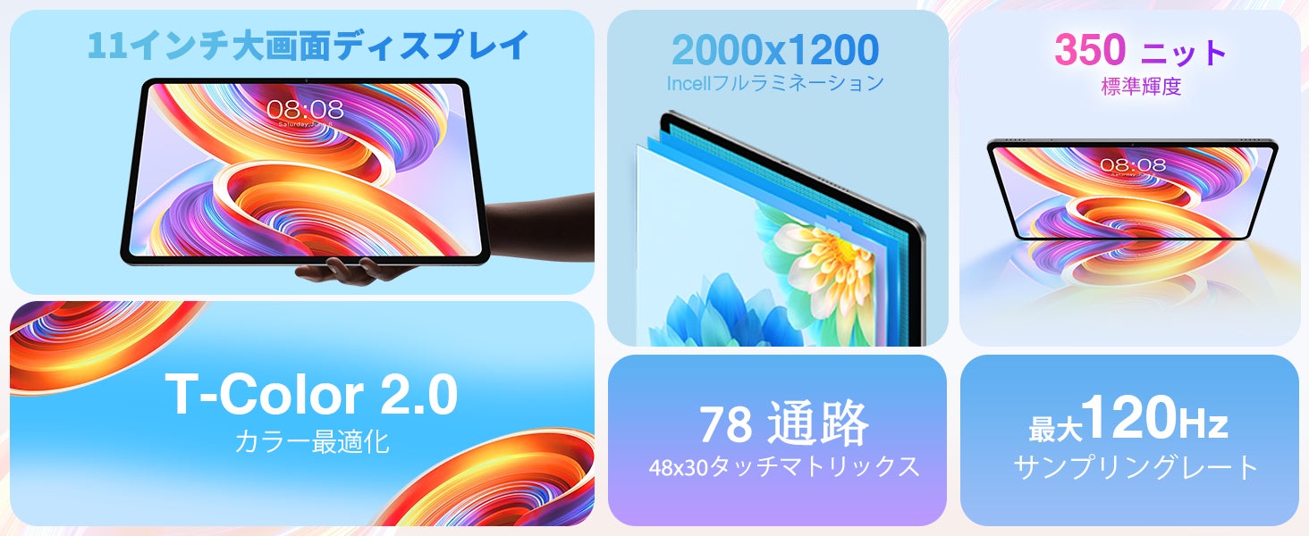 更に大きな11インチ2kのスディスプレイを使用して、より広い画面領域を提供できます。TDDIテクノロジーが利用されたディスプレイは、タッチセンサーをLCDの既存の構造に統合します。反射を減らし、タッチ応答性を向上させます。また、T-Color 2.0カラー最適化アルゴリズムにより、より鮮やかでリアルな色が表示されます。7500mAh超大容量のバッテリーを搭載されて、18W USB-PD急速充電もサポートしているため、より長い待機時間を提供できます。