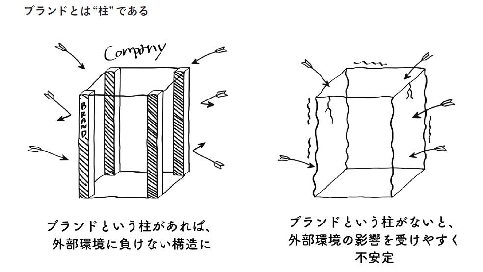 ブランディングとは「柱」です。決して特別なものである必要はありませんが、なくてはならないものです。企業という建物は、「プロダクト」やその背景にある「経営者や企業の強い思い」といった柱があってこそ、安定して自立できるのです。本書では、企業の中にある「柱にしたいもの」「柱になるべきもの」を、誰もが納得するブランドとして確立させるための施策を「ブランディング」と呼んでいます。