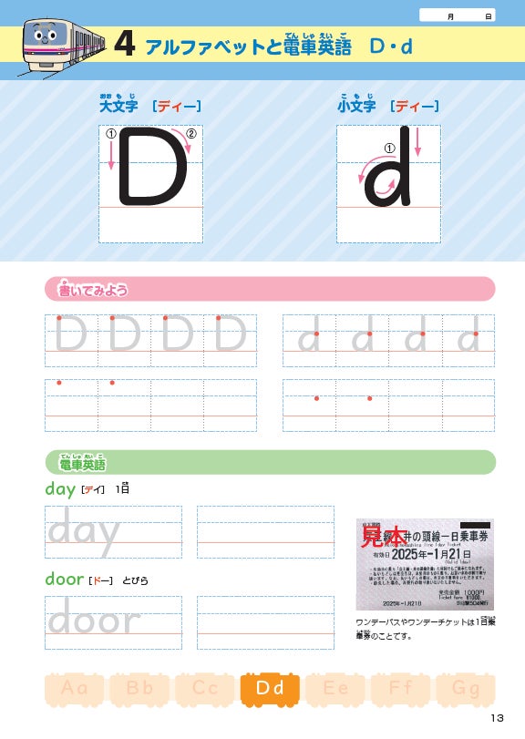 『電車で楽しく小学英語ドリル アルファベット・ローマ字』は、京王電鉄株式会社の協力のもと、かっこいい電車写真&キャラクターとともに、アルファベット・ローマ字を書く練習ができる英語ドリルです。電車にまつわる英単語にふれながら、英語が好きになることを目指します。