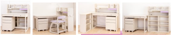 お子様の成長や、お部屋の間取りに合わせて、(下記画像左から)スタンダードスタイル、L字シェルフスタイル、L字カウンタースタイル、セパレートスタイルと、スタイル自由自在ですので生活シーンにあわせてながく使える学習机です。