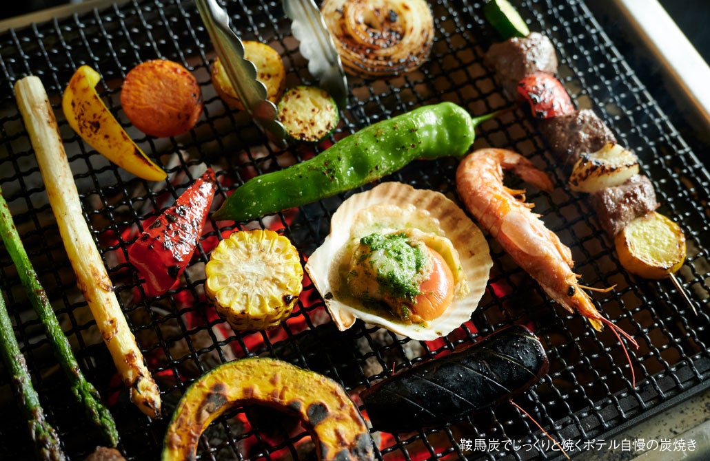 ブッフェのなかでもイチ押しは、京都の鞍馬炭でじっくりと焼き上げる“炭焼きグリル”。