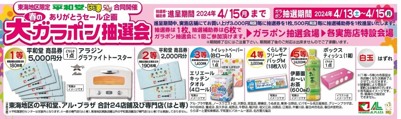 ・4月6日(土)~4月15日(月)の期間に、対象店舗で3,000円(税抜)お買い上げごとに抽選券を1枚進呈し、平和堂商品券やトースターが当たるガラポン抽選会を開催します。