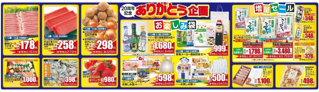 20年という節目を迎えられたことへの感謝の気持ちをこめて実施する「ありがとうSale!」は、「生しるこサンド」や東海エリアの地酒を集めた「愛三岐地酒飲み比べセット」など、東海エリアならではの商品をお買い得価格でご用意するほか、「増量セール」や「HOP会員様限定」の商品もラインナップし、日頃のご愛顧への感謝を込めた特別な商品でお客様をお迎えします。この他、平和堂・はと専合同企画として、「春の大ガラポン抽選会」も開催しますので、ぜひご来店ください。