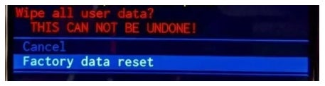 Step2:リカバリーモードが起動したら音量ボタンを押して「Wipe data/factory reset」を選び、電源ボタンを押します。