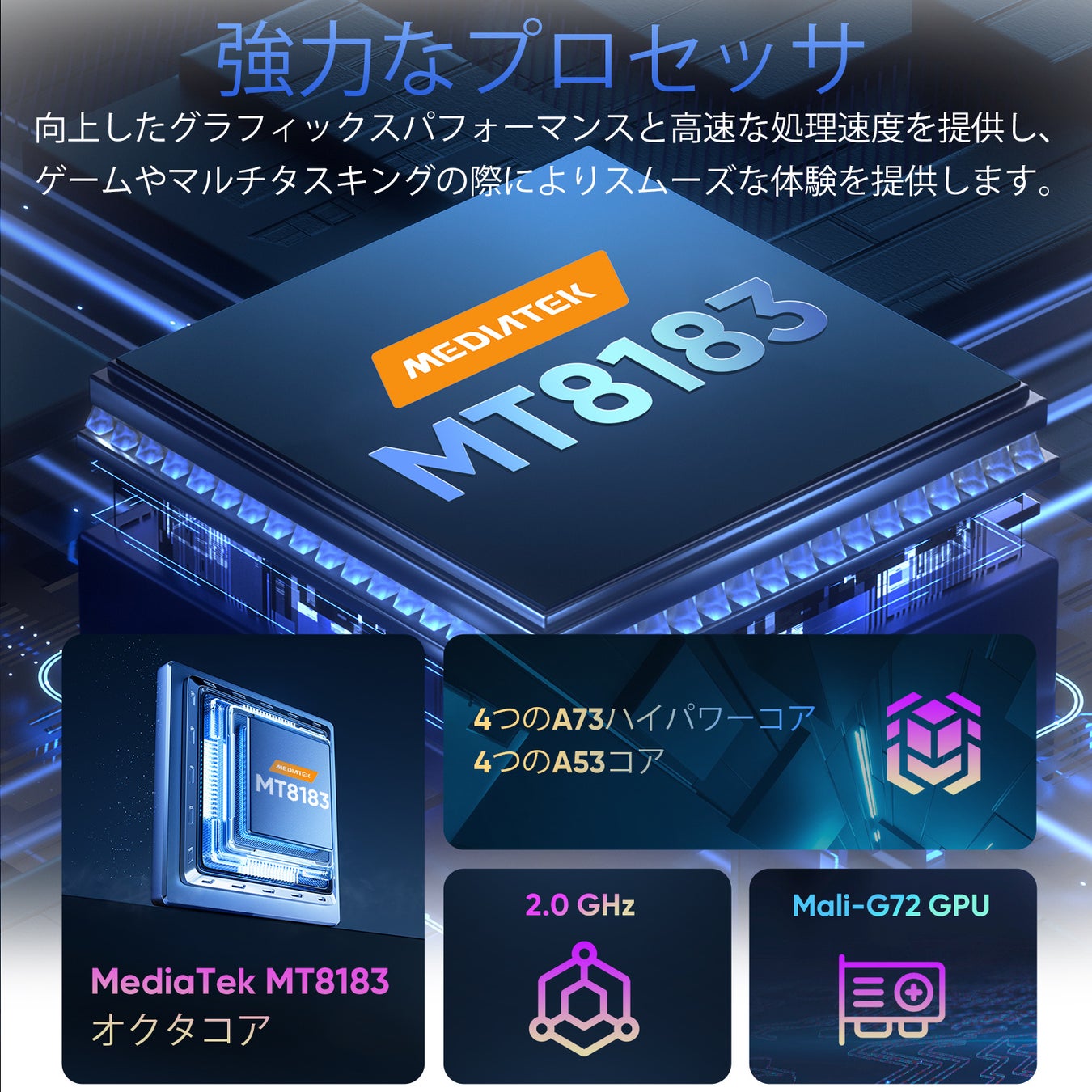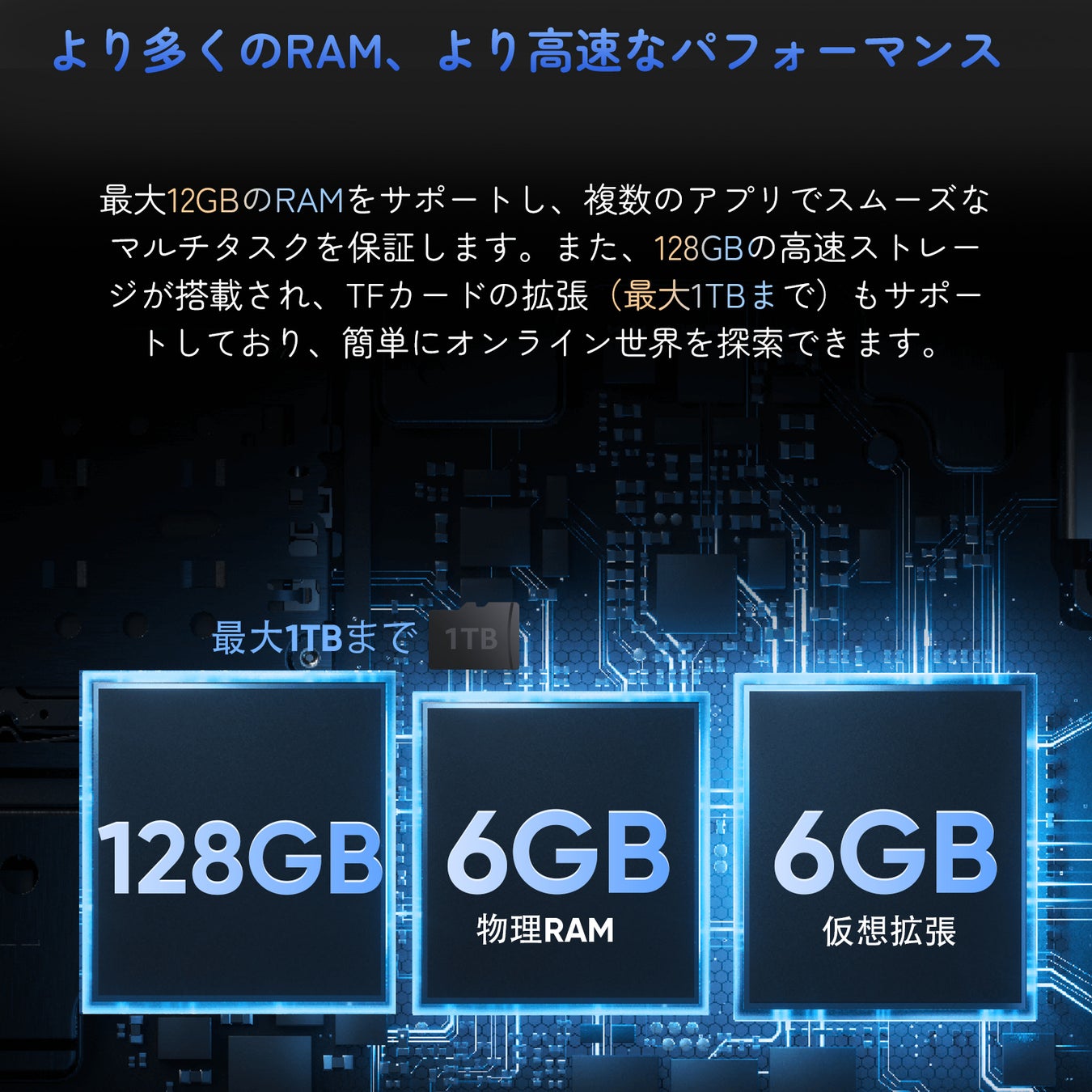 大容量メモリとストレージ:8GBのRAMメモリ(4GB内蔵 + 4GB拡張)と64GBの内部ROMメモリに加え、最大1TBまでのTFカードサポート。さまざまなアプリの利用や大容量データの管理に対応します。