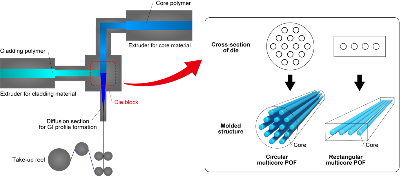 本研究グループは、このようなニーズに応えるべく、高速通信が可能なGI型POFを押出成形により一括多心化する技術を確立しました。この手法により作製されたマルチコアGI型POFは、1心あたり100 Gbpsを超える超高速伝送を実現するとともに、従来のガラス製光ファイバで必要とされていた煩雑な多心化工程を不要とすることで、大幅なコスト削減に貢献できます。さらに、GI型POFを用いた伝送では、従来のガラス製光ファイバに比べて信号のノイズやエラーが大幅に抑制されることを実証し、補正処理の簡素化を通じて、低遅延かつ低消費電力の光通信を実現できる可能性を示しました。